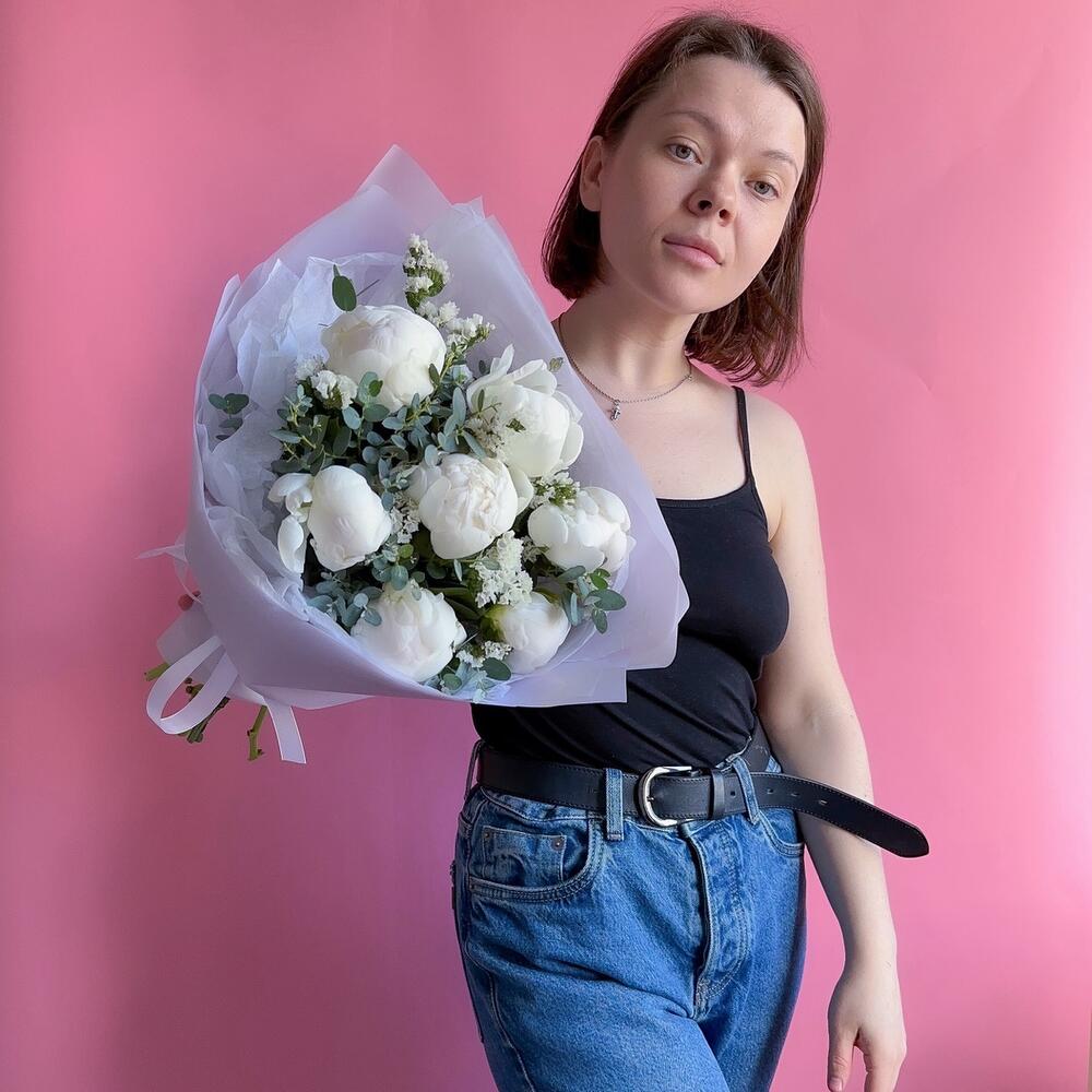 пионы – 7 шт.Статица – 3 шт.Эвкалипт – 2 шт.Упаковка дизайнерская – 1 шт.