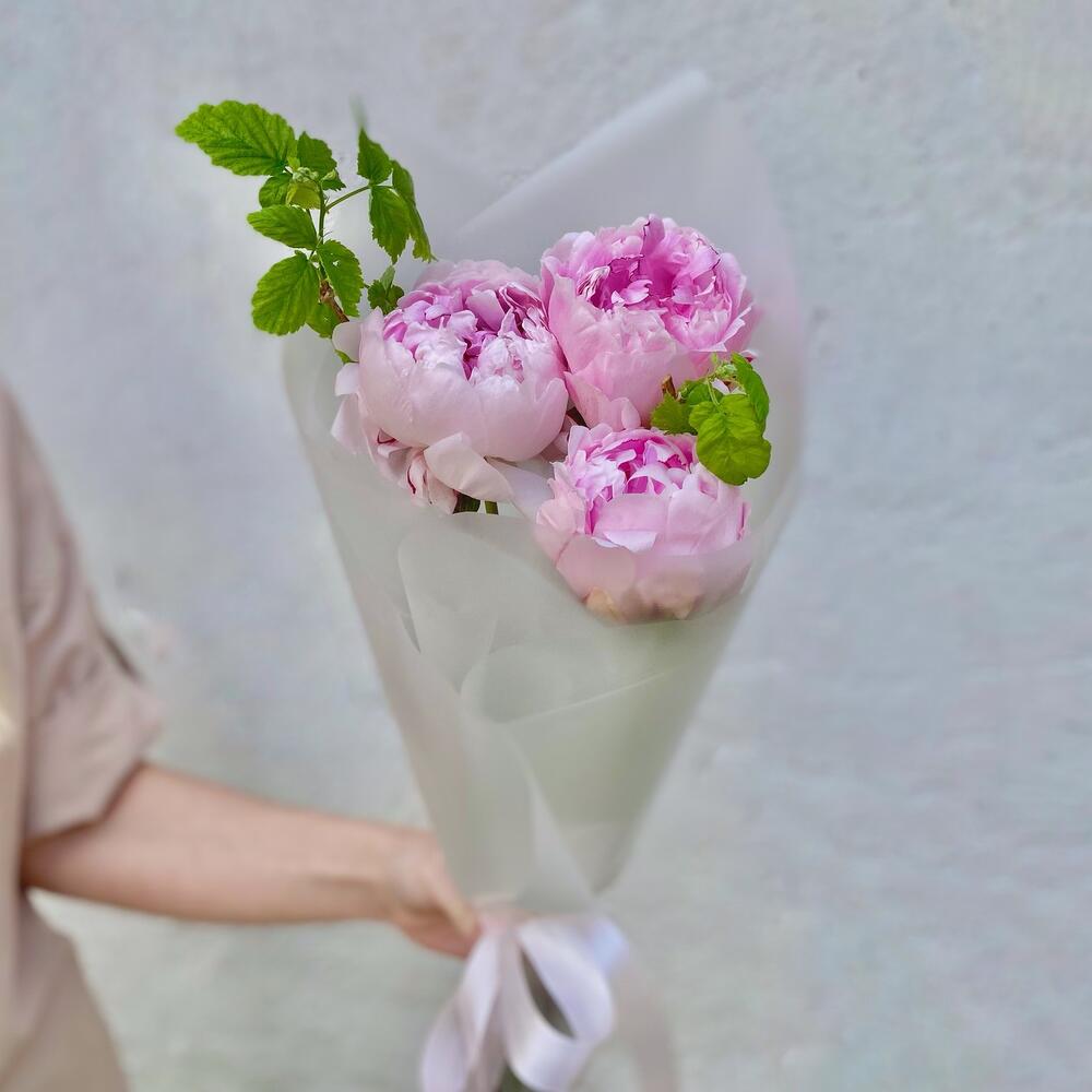 Пион Сара Бернар – 3 шт.Упаковка дизайнерская – 1 шт.ветка малины – 1 шт.