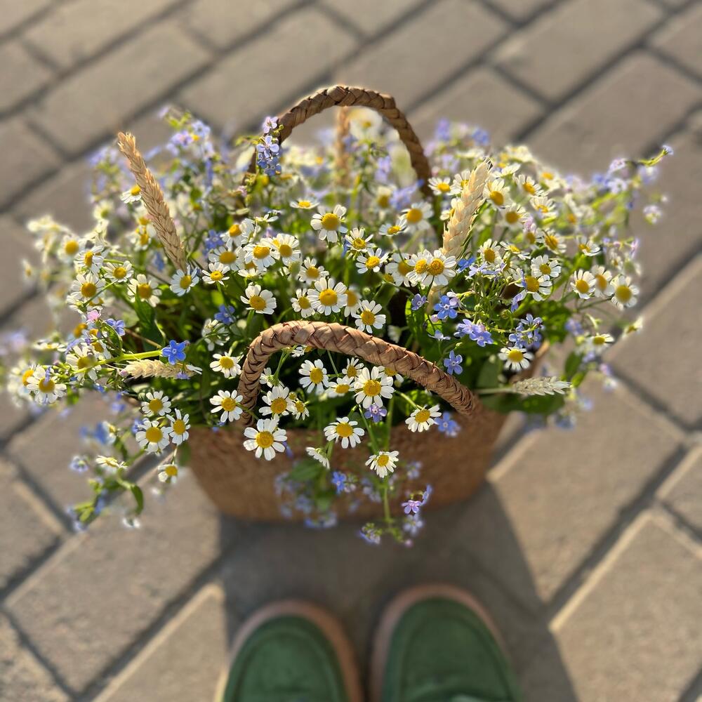 Ромашки и незабудки в плетёной сумке