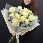11 белых роз Moonstone с веточками эвкалипта