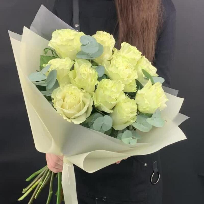 11 белых пионовидных роз с эвкалиптом