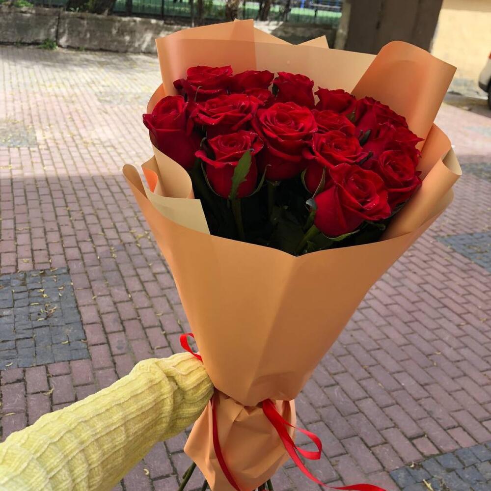 красная роза эквадор эксплорер 70 см – 15 шт.Корейская пленка – 2 шт.Атласная лента – 1 шт.