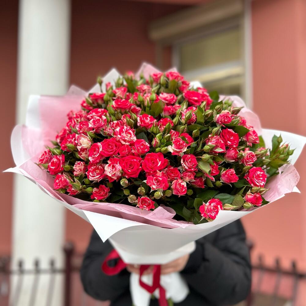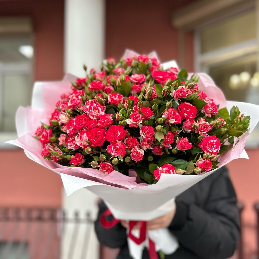 Букет из 15 веток кустовых роз сорта фаерворкс с оформлением, количество бутонов(розочек) в букете может достигать 101 штуки .