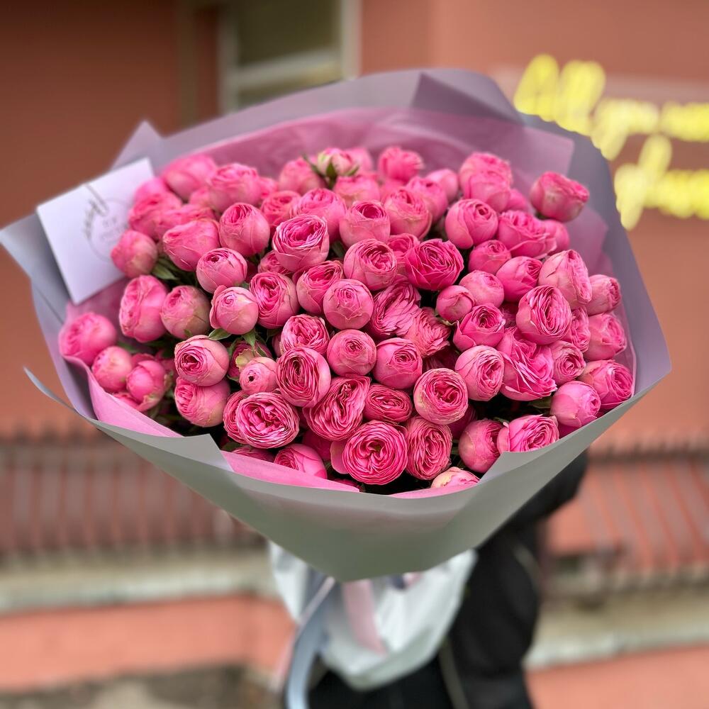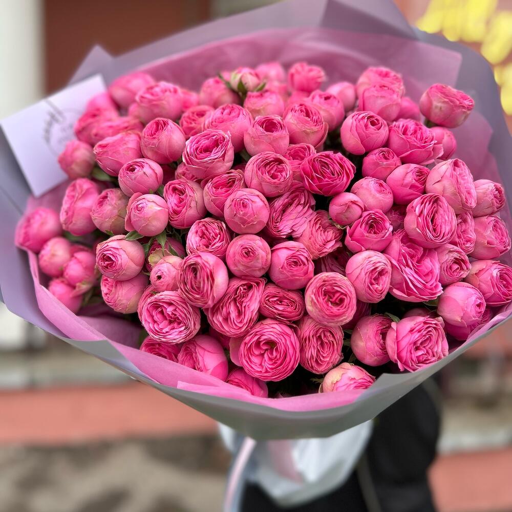Букет из 25 веток кустовых пионовидных роз ,в дизайнерском оформлении. Количество розочек (бутонов ) в букете может достигать 151 штуки