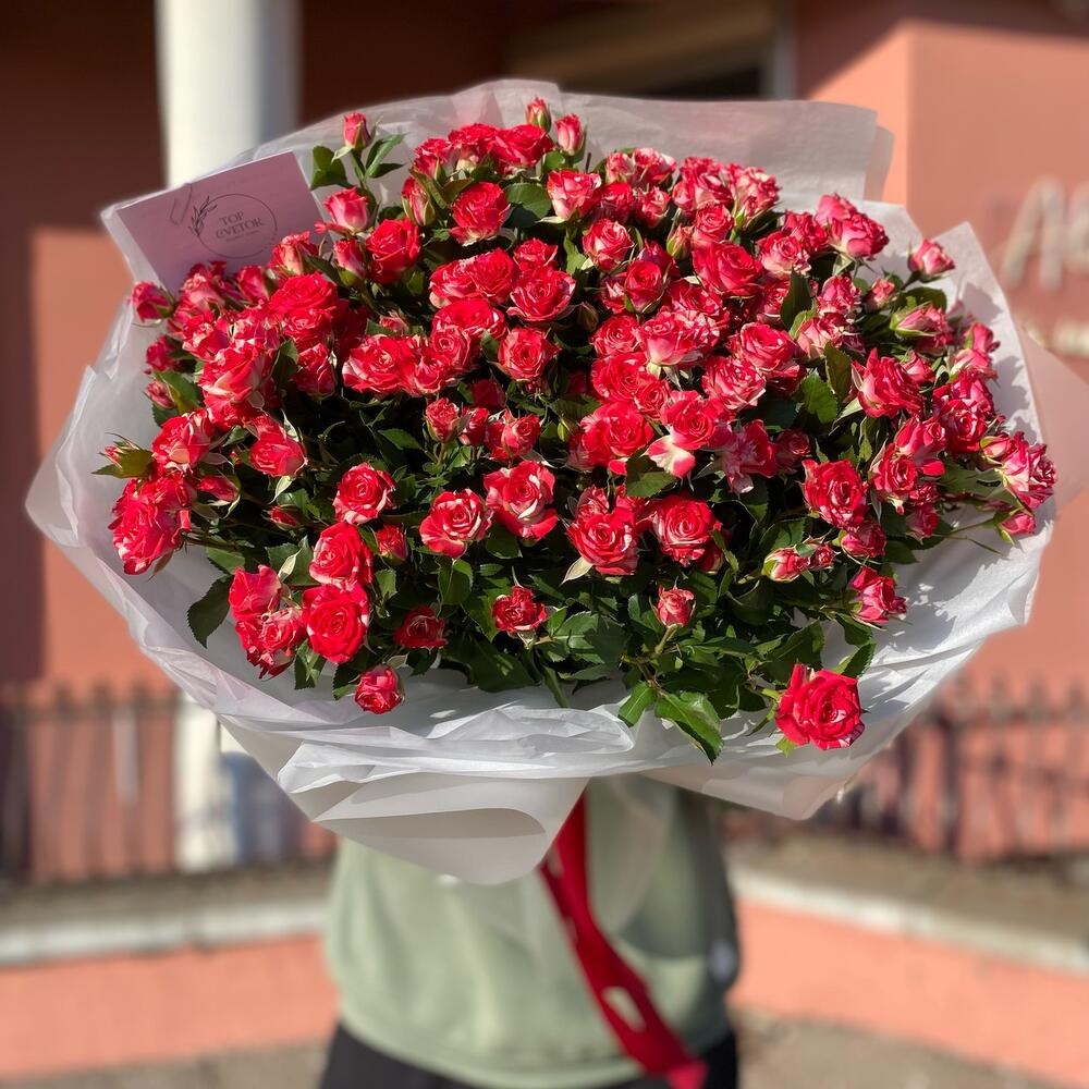 Букет из 25 кустовых веток сорта Fireworks с дизайнерским оформлением. Количество розочек (бутонов ) в букете может достигать 171 штуки