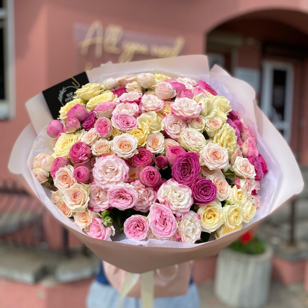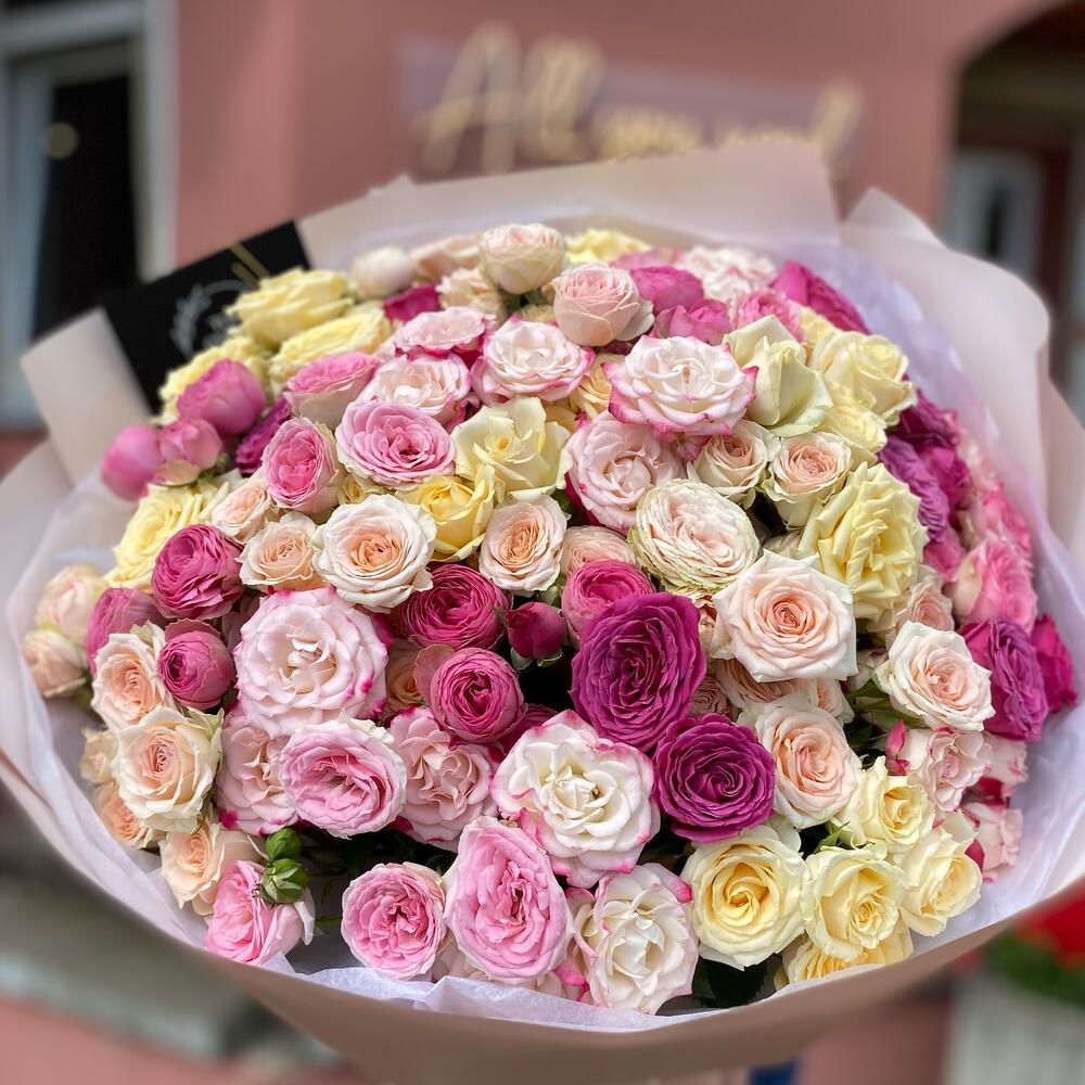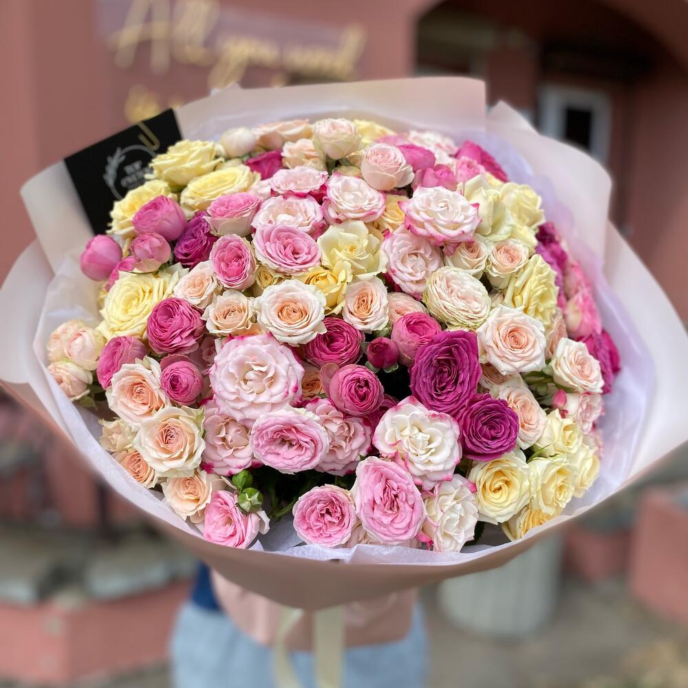 Гвоздики, Кустовые розы, Лизиантусы, Пионовидные розы, Розы