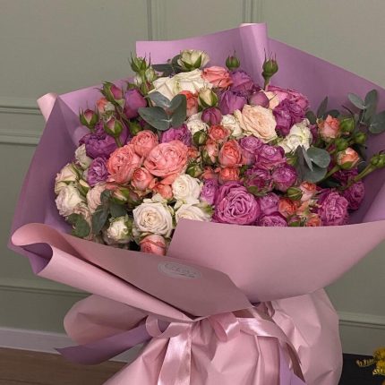 Пионовидные кустовые розы , сорт Мисти Баблс в крафт упаковке