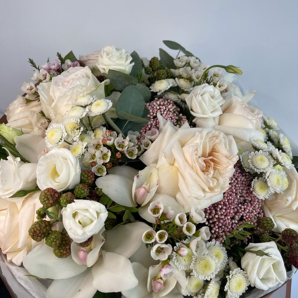 Ваксфлауэр – 2 шт.Лизиантус – 2 шт.Озотамнус – 4 шт.Эвкалипт – 2 шт.Роза Эквадор – 7 шт.Сантини – 5 шт.Фисташка – 4 шт.орхидея – 7 шт.Рубус – 4 шт.