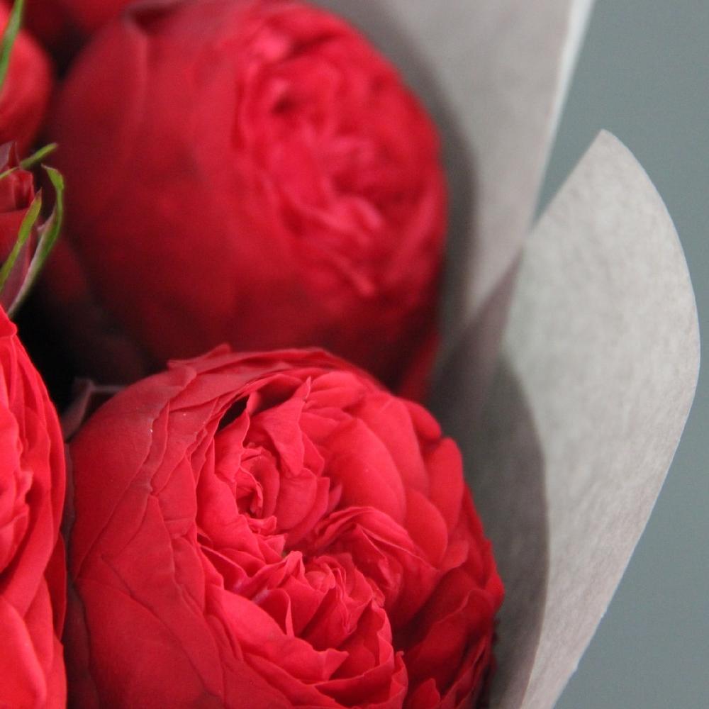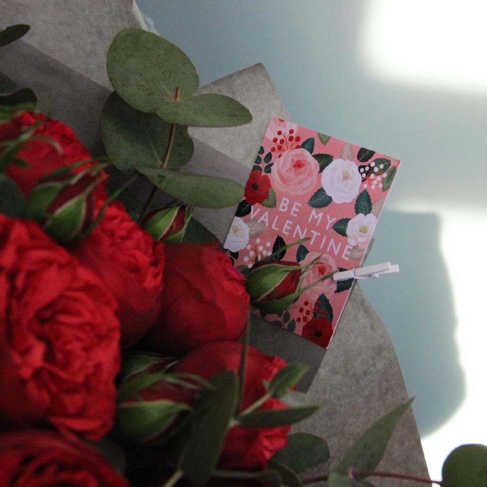 Роза пионовидная – 15 шт.Эвкалипт – 7 шт.Упаковка дизайнерская – 3 шт.Лента атласная – 2 шт.Открытка – 1 шт.