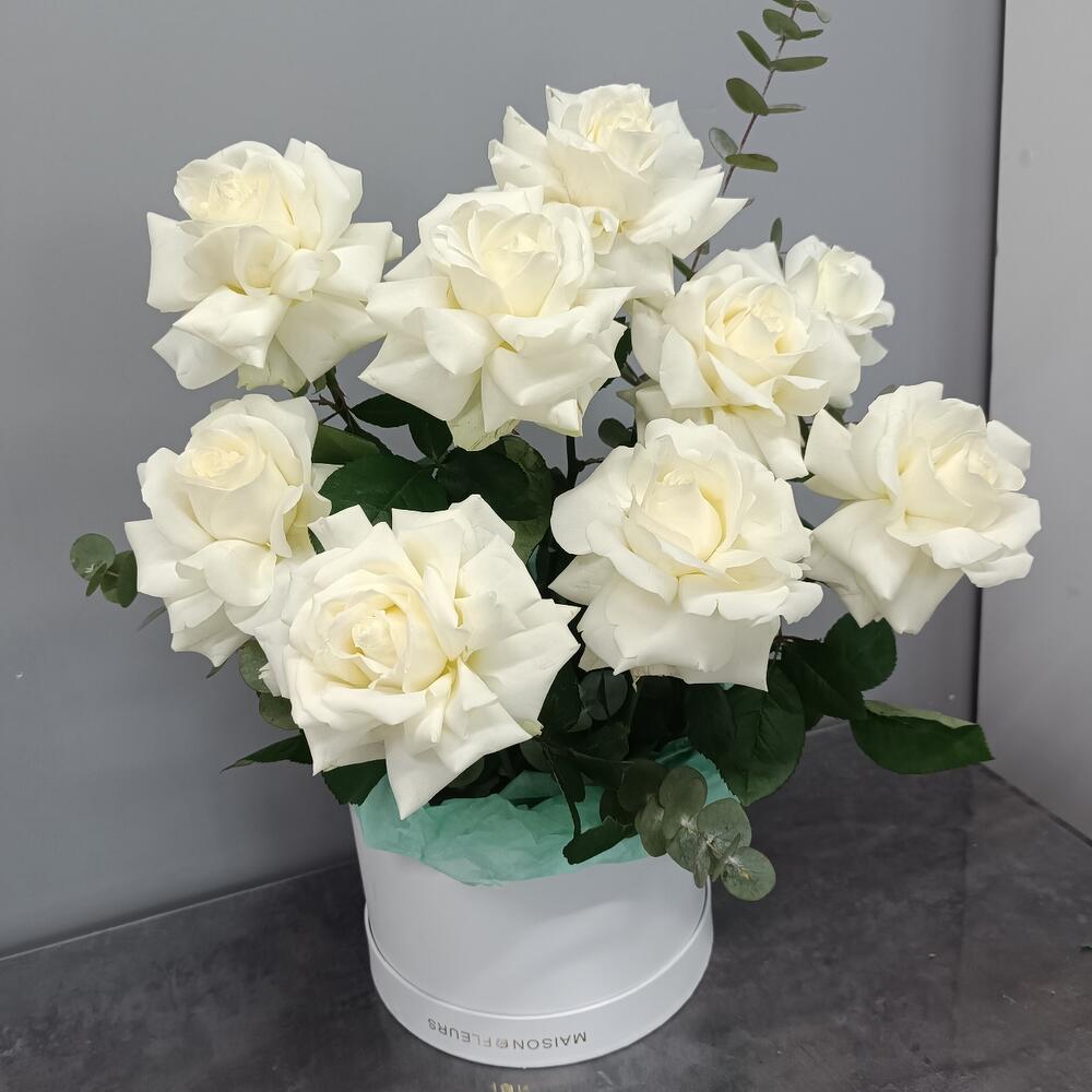 французские розы – 5 шт. Эвкалипт – 2 шт. открытка с вашими пожеланиями – 1 шт.