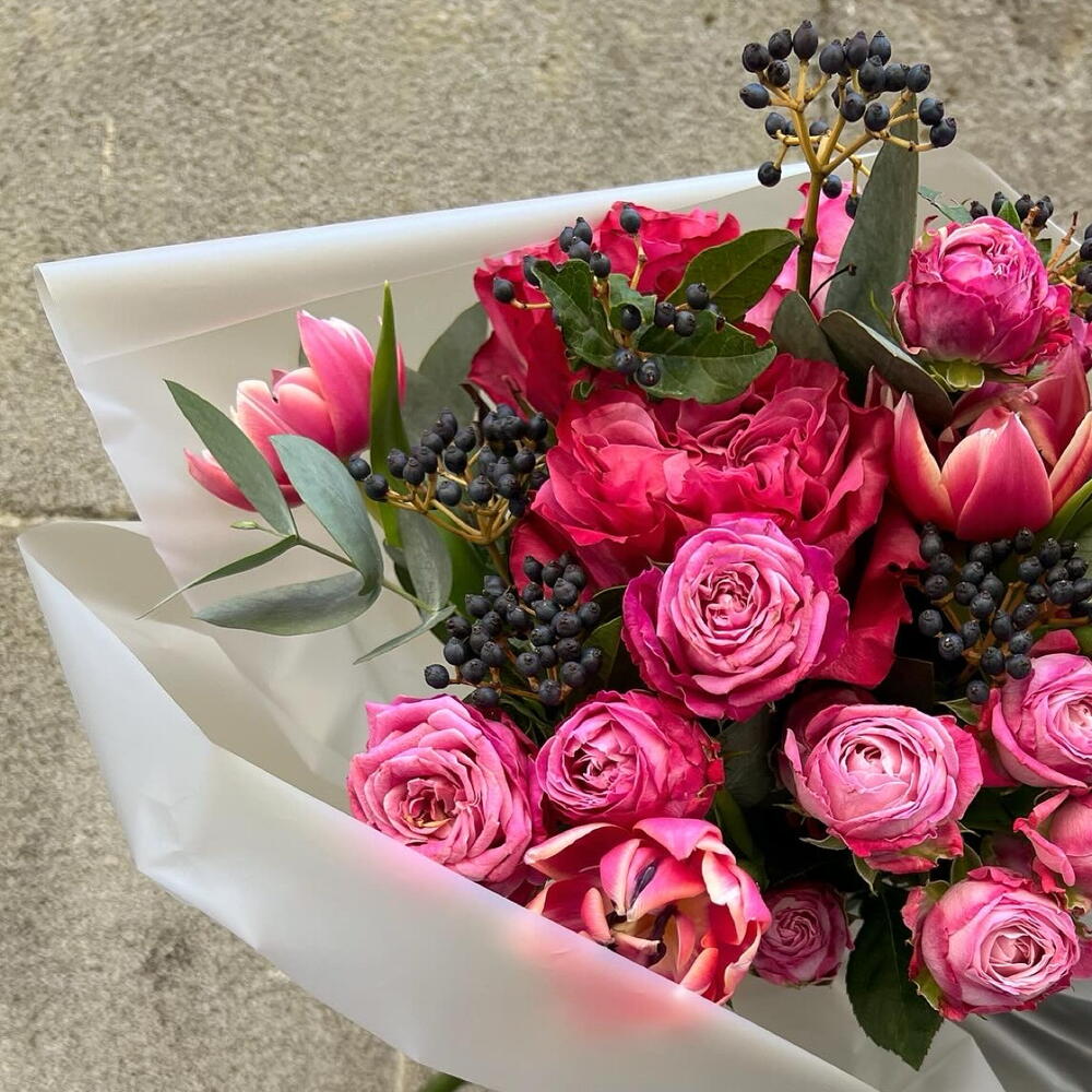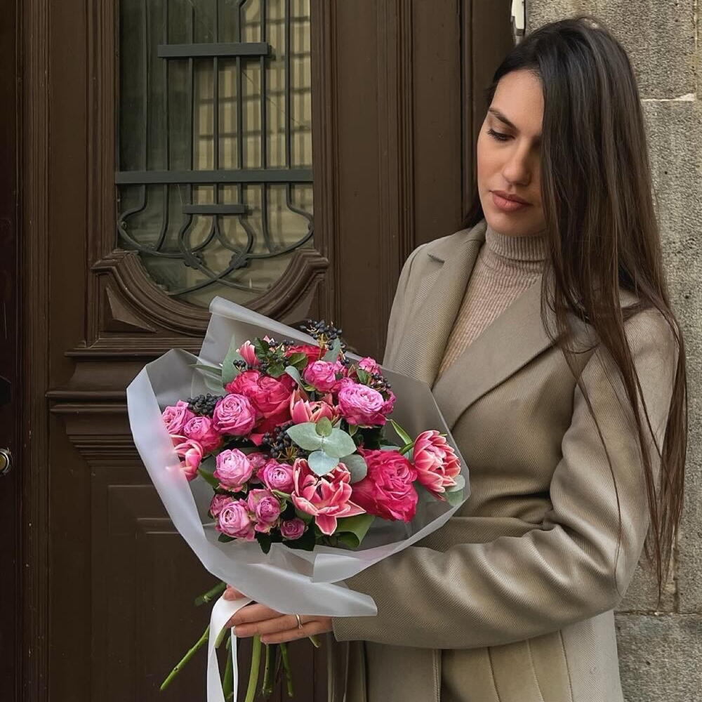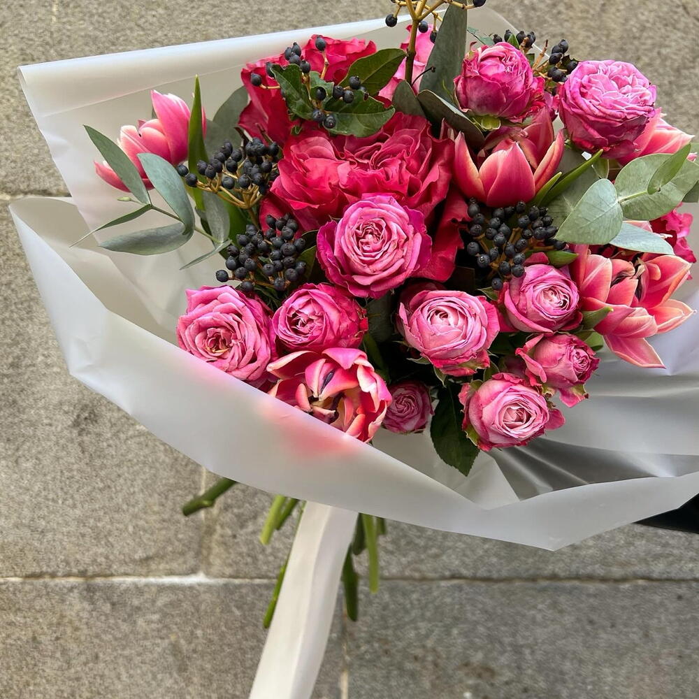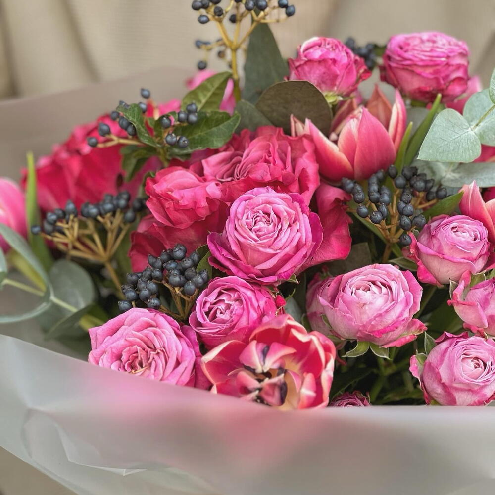 Гвоздики, Лизиантусы, Розы, Тюльпаны