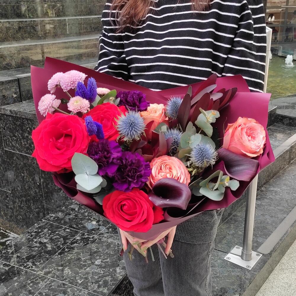 Роза кахала – 3 шт.Роза красная – 3 шт.Диантус – 3 шт.Фаларис – 10 шт.эваклипт – 3 шт.Эрингиум – 1 шт.леокендрон – 2 шт.Упаковка дизайнерская – 1 шт.Лента атласная – 2 шт.калла черничная – 2 шт.