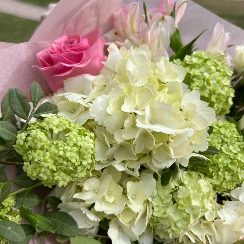 Роза кустовая пионовидная – 1 шт.Роза одноголовая – 1 шт.Вибурнум – 1 шт.Гортензия – 1 шт.Роза кустовая – 1 шт.Альстромерия – 1 шт.зелень фисташки – 1 шт.