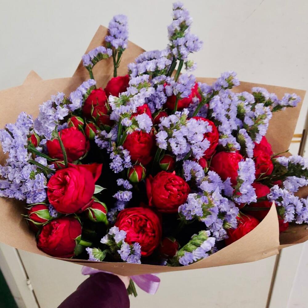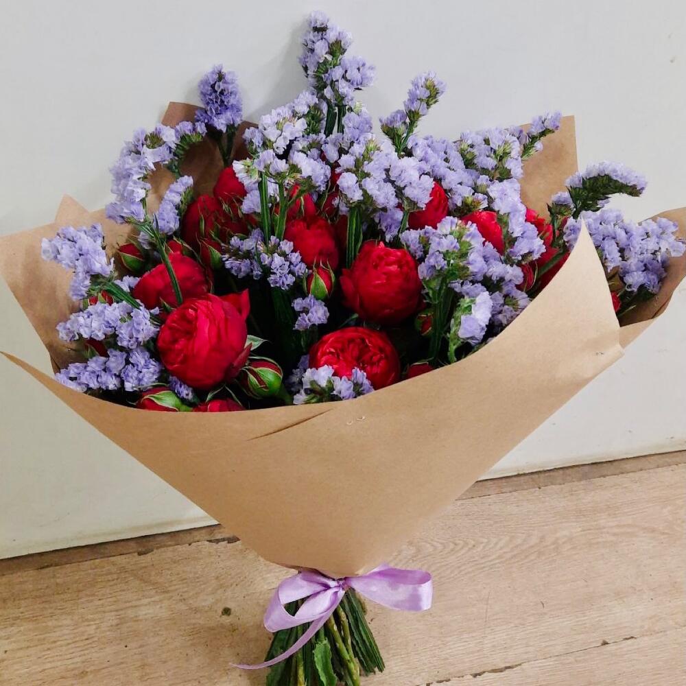 пионовидная роза Red Piano 50 см – 20 шт.Лимониум сиреневый – 9 шт.крафтовая бумага подарочная – 1 шт.
