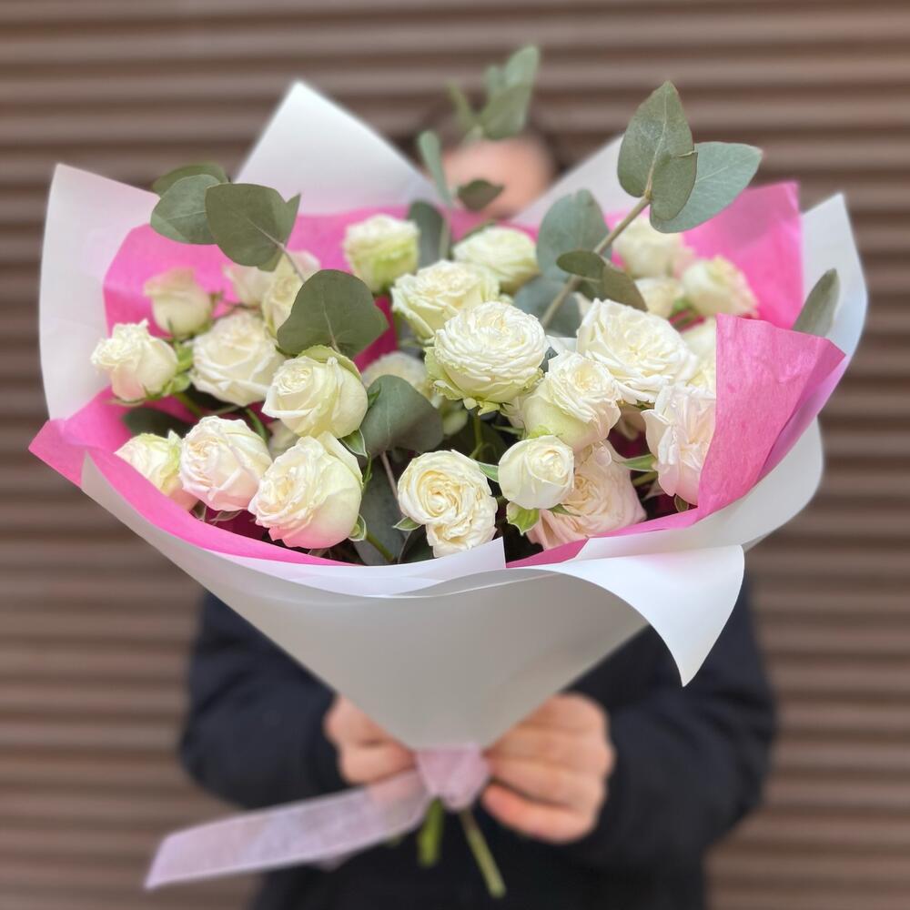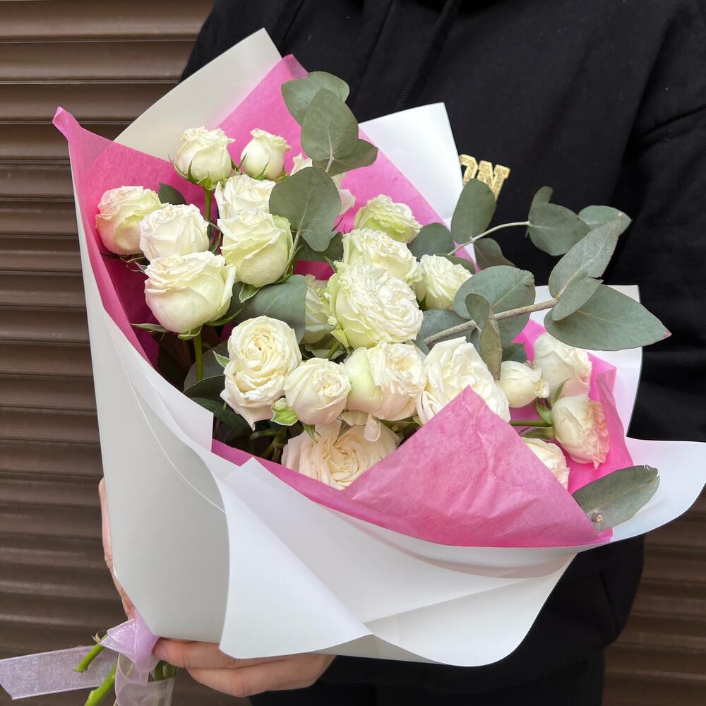 Авторский букет из французских и пионовидных роз с эвкалиптом