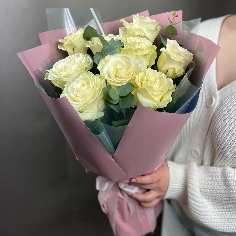 Букет из 9 белых роз с эвкалиптом