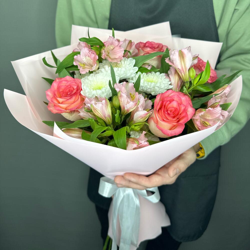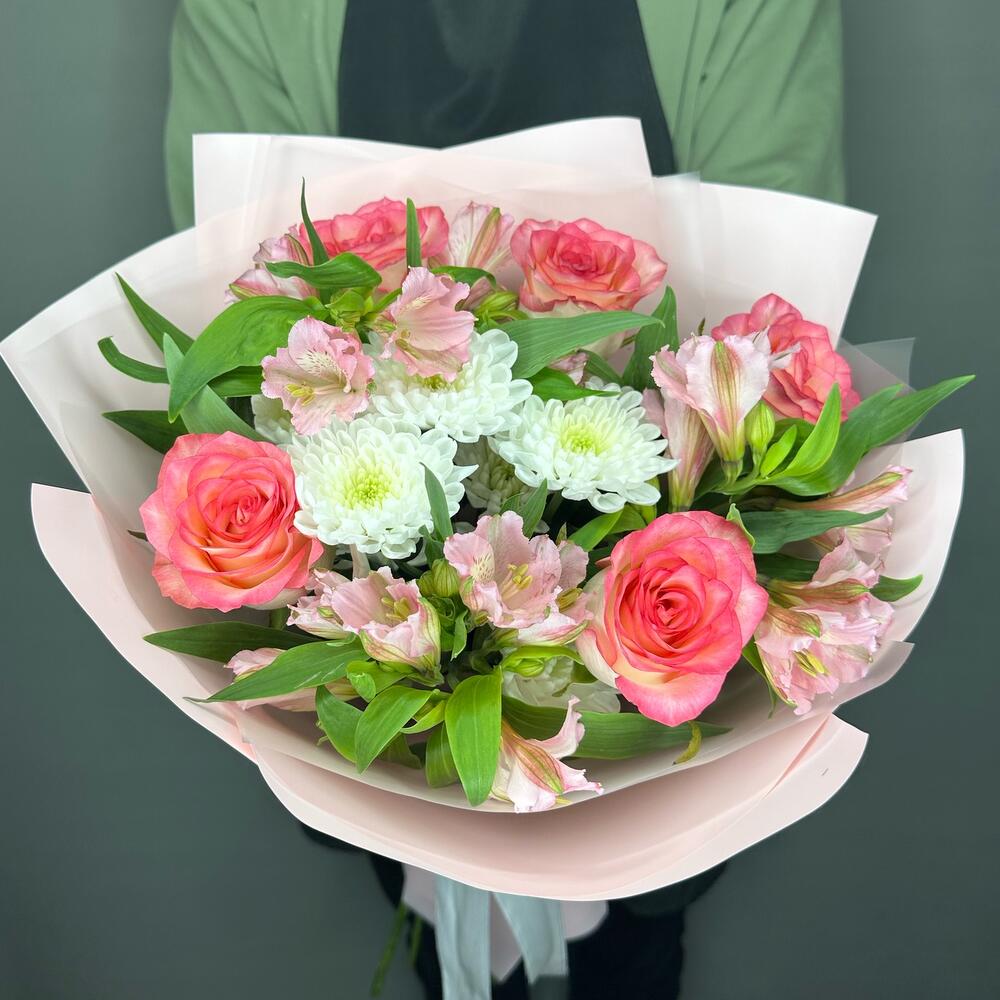 Букет из альстромерий, роз и кустовой хризантемы