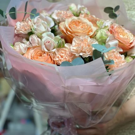 Нежный, легкий букет из стойких хризантем, диантуса и очаровательной пионовидной розы Джульетта