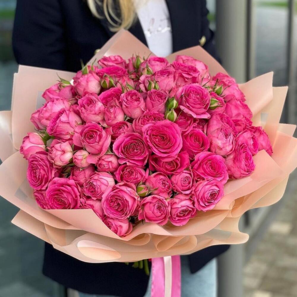 розовые кустовые розы – 51 шт.Упаковка дизайнерская – 2 шт.Лента атласная – 2 шт.Открыточка с вашими пожеланиями – 1 шт.хорошее настроение – 100 шт.инструкция по уходу за цветами – 1 шт.коробка переноска – 1 шт.Кризал – 1 шт.