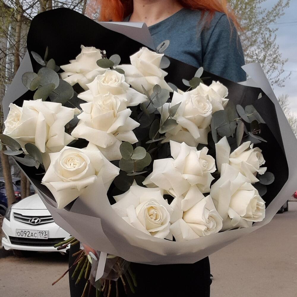 Эвкалипт – 6 шт.Лента атласная – 3 шт.Упаковка дизайнерская – 4 шт.Роза французская – 13 шт.
