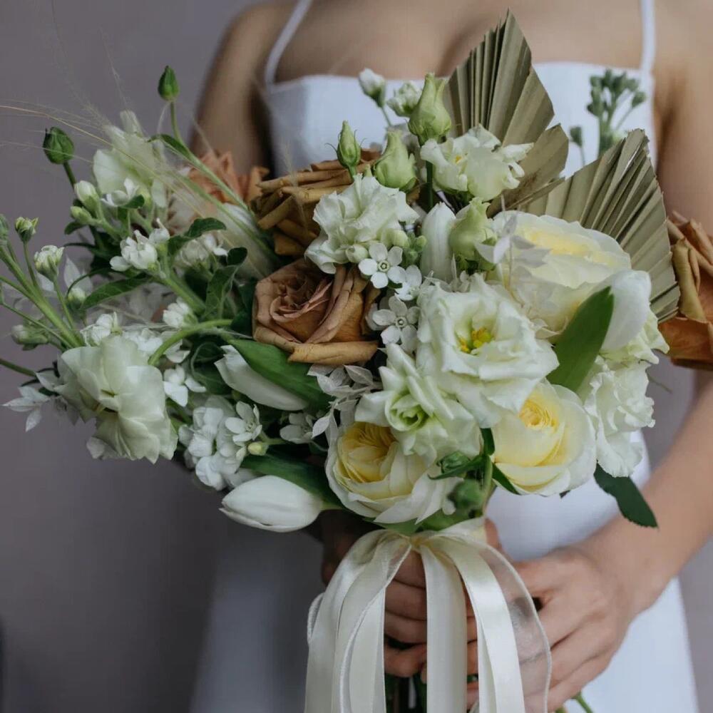 Лизиантус – 2 шт.Маттиола – 3 шт.Тюльпан – 5 шт.Пионовидная роза – 7 шт.Атласная лента – 2 шт.Оксипеталум – 5 шт.рускус сухоцвет – 2 шт.пальмовое копье – 2 шт.японский ранункулюс – 3 шт.