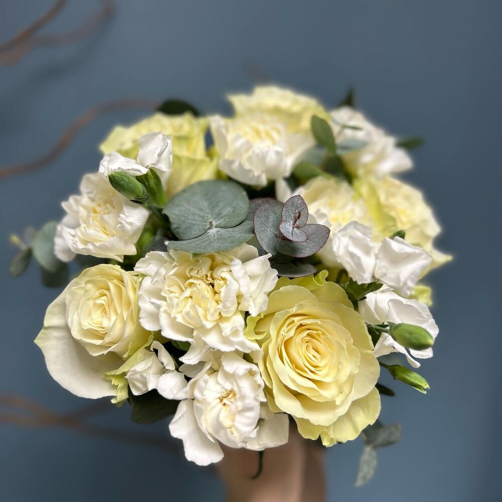 Эвкалипт – 1 шт.гвоздика соломио – 3 шт.Гвоздика – 7 шт.Роза Мондиаль – 5 шт.Лента атласная – 1 шт.