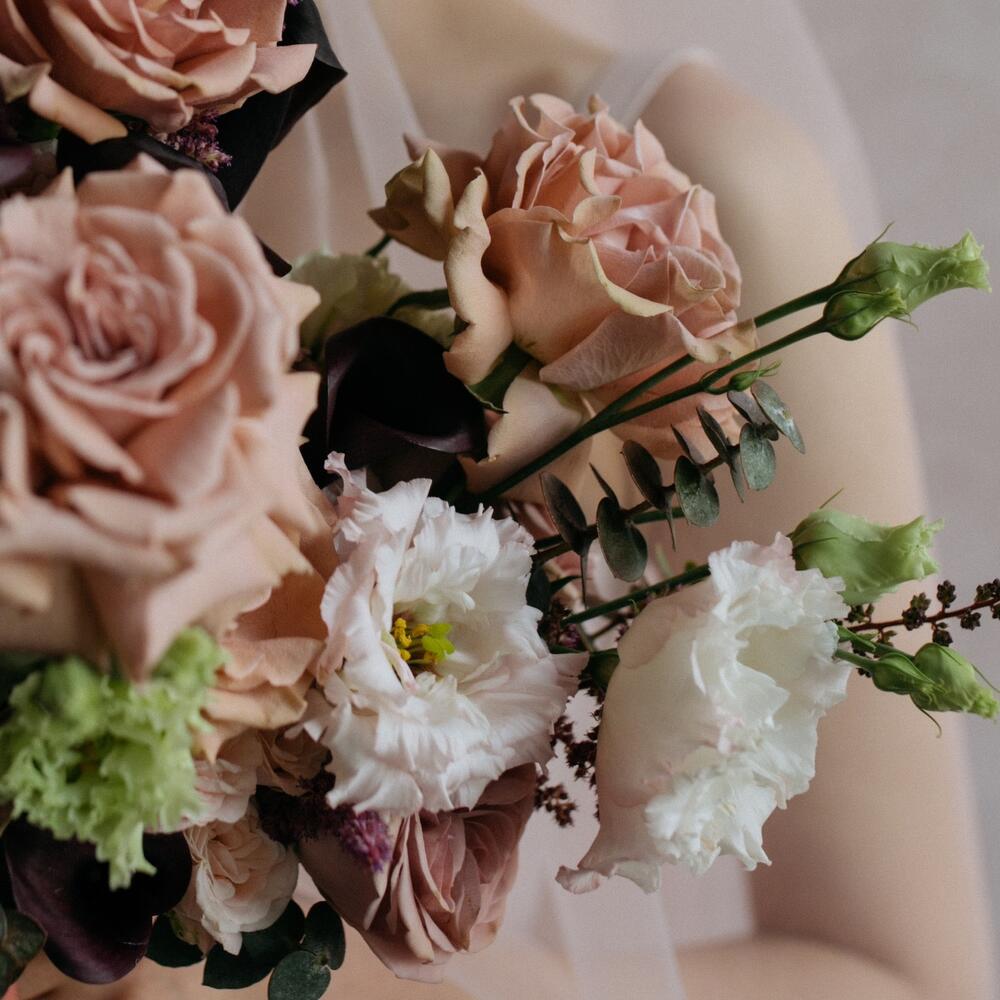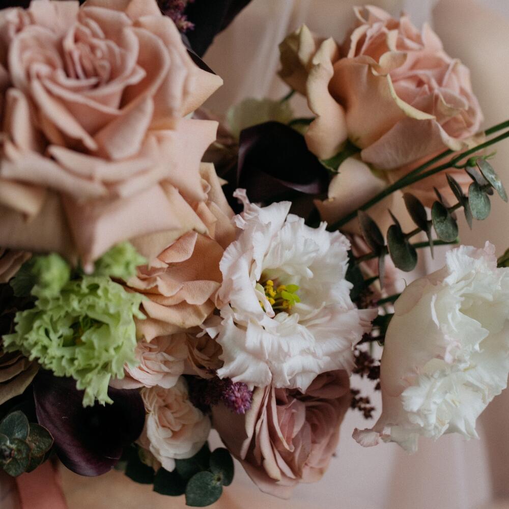 Астильба – 5 шт.Калла – 7 шт.Лизиантус – 1 шт.Эвкалипт – 5 шт.Пионовидная роза – 9 шт.Атласная лента – 2 шт.Кустовая пионовидная роза – 3 шт.