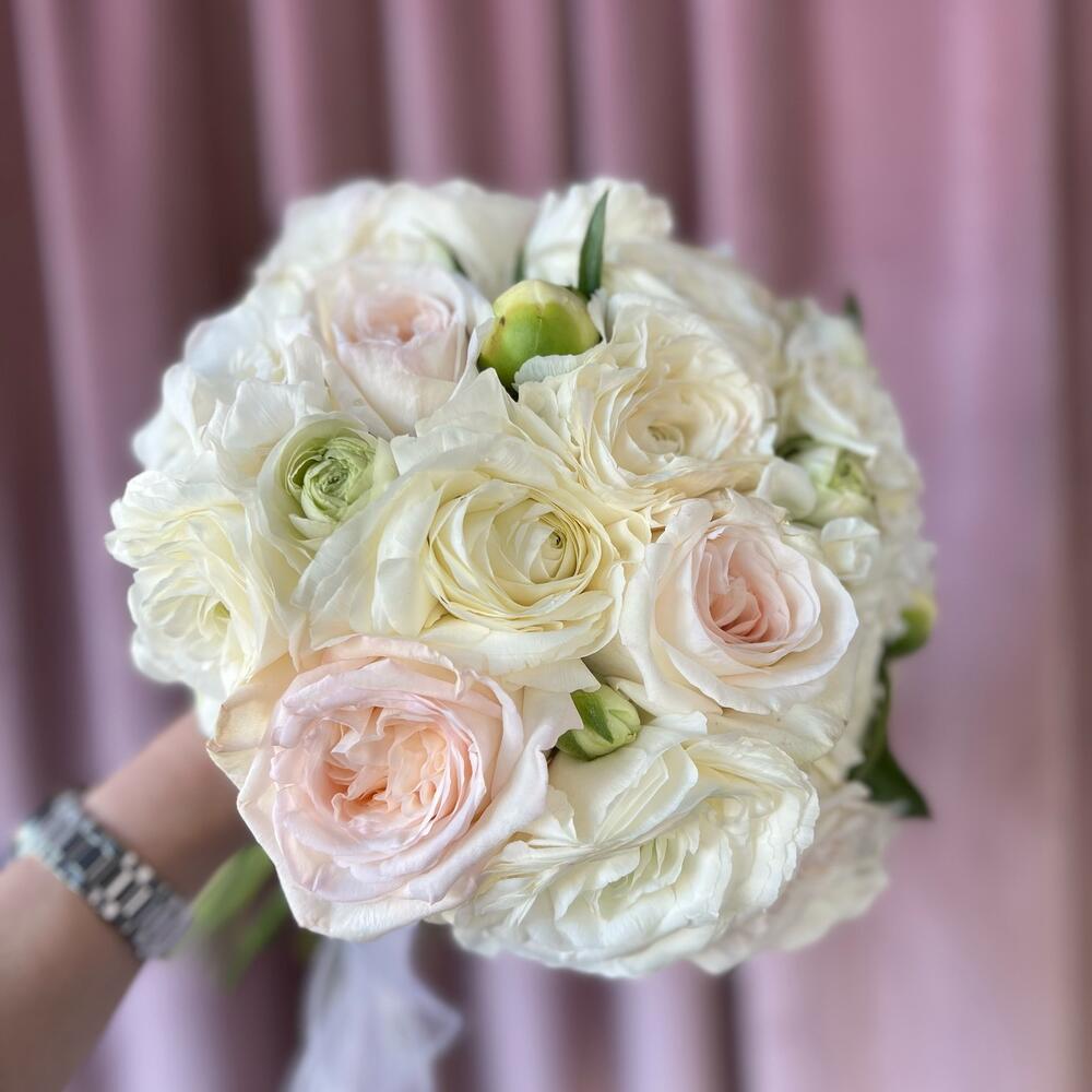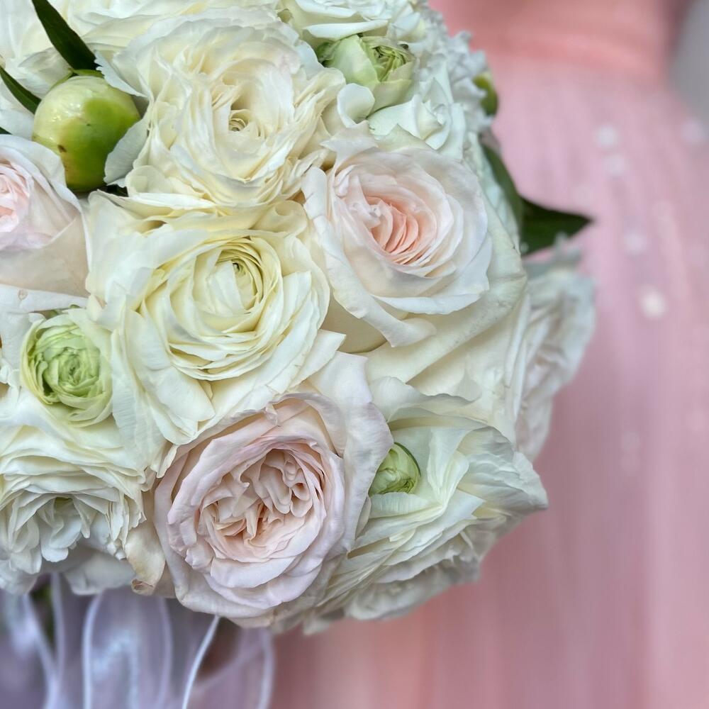 Ранункулюс – 7 шт.Пионовидная роза – 7 шт.пионы – 3 шт.Атласная лента – 3 шт.