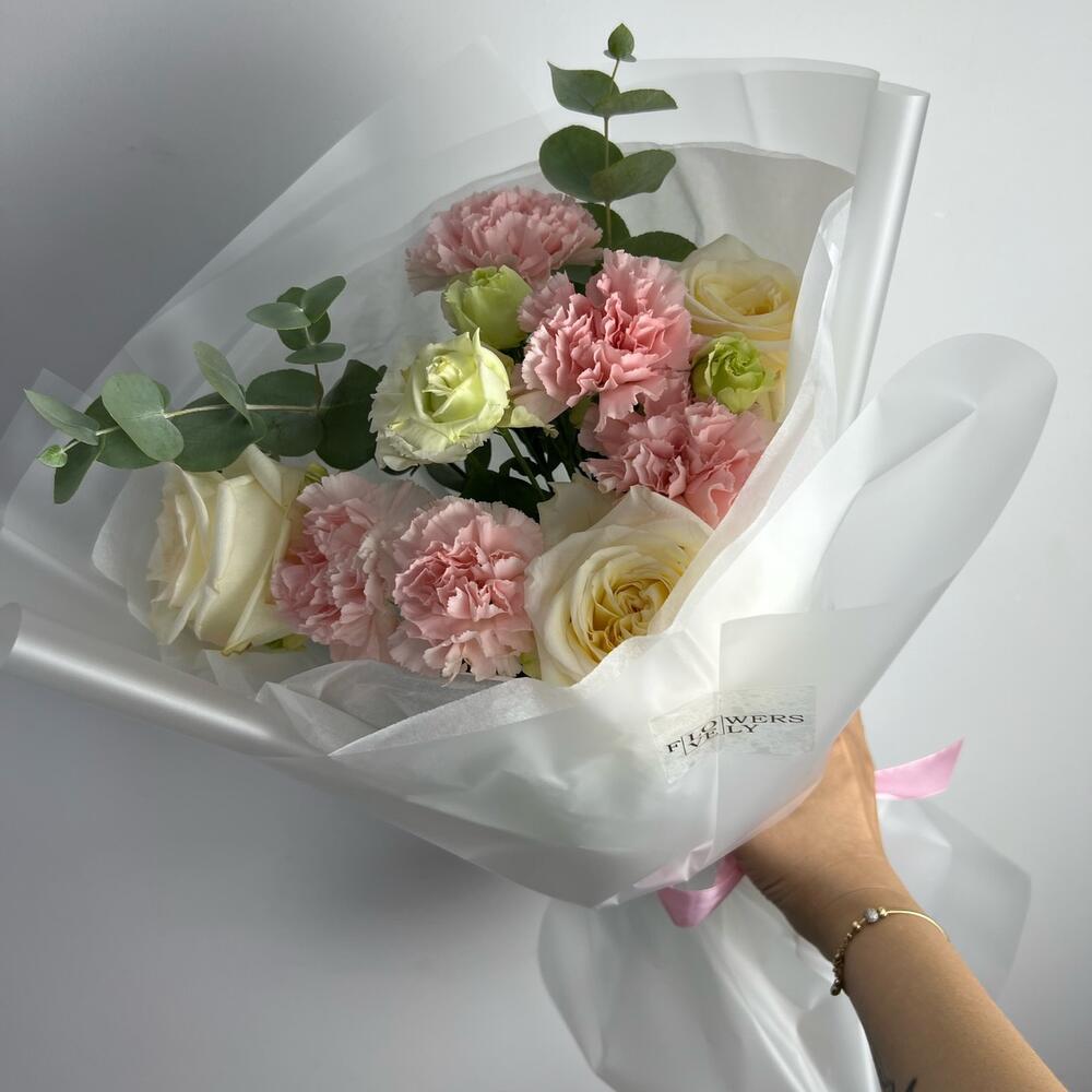 Гвоздики, Лизиантусы, Розы, Тюльпаны