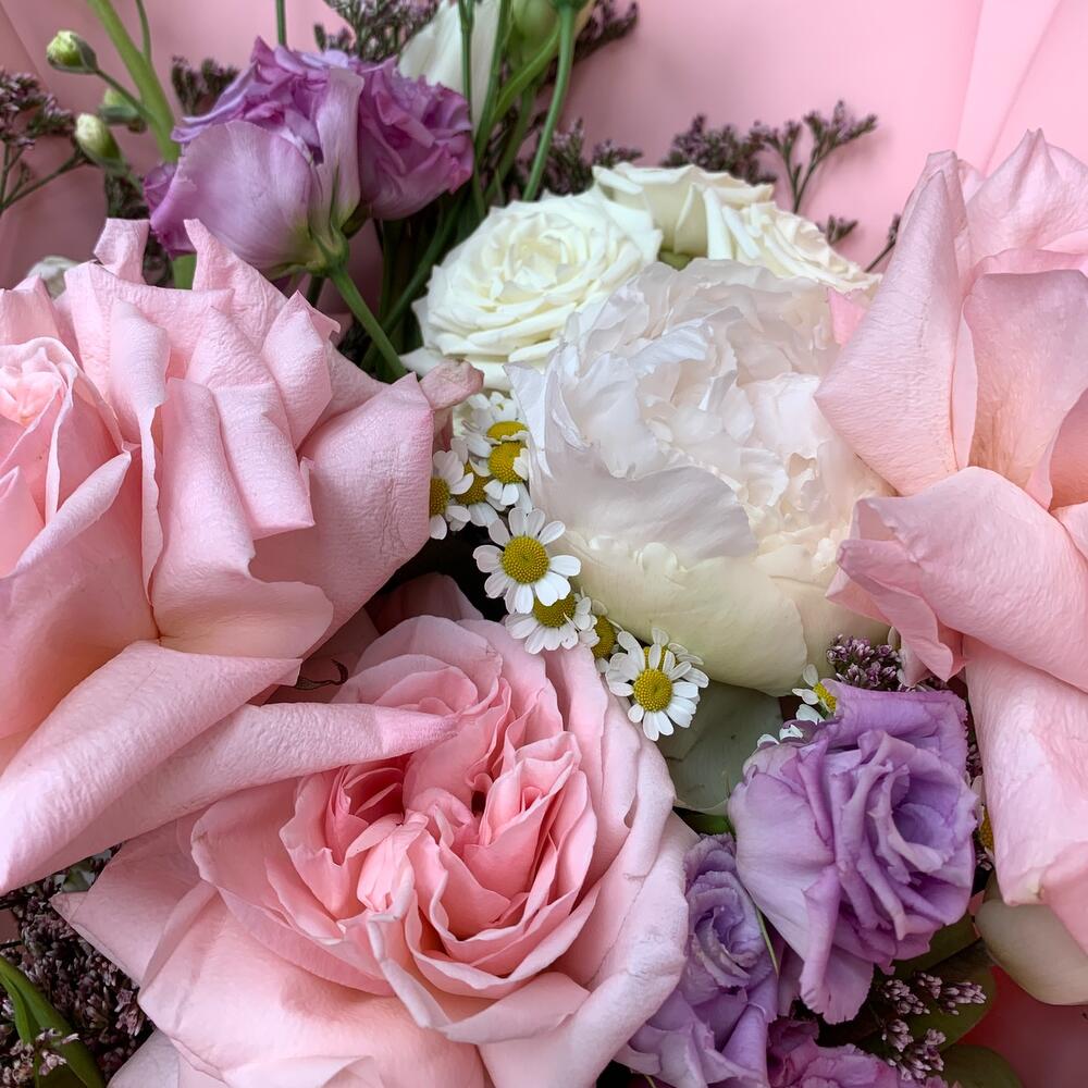 Лизиантус – 2 шт.Лимониум – 2 шт.Маттиола – 2 шт.Пион – 1 шт.Тюльпан – 3 шт.Кустовая роза – 1 шт.Пионовидная роза – 3 шт.декоративная упаковка – 1 шт.Атласная лента – 1 шт.