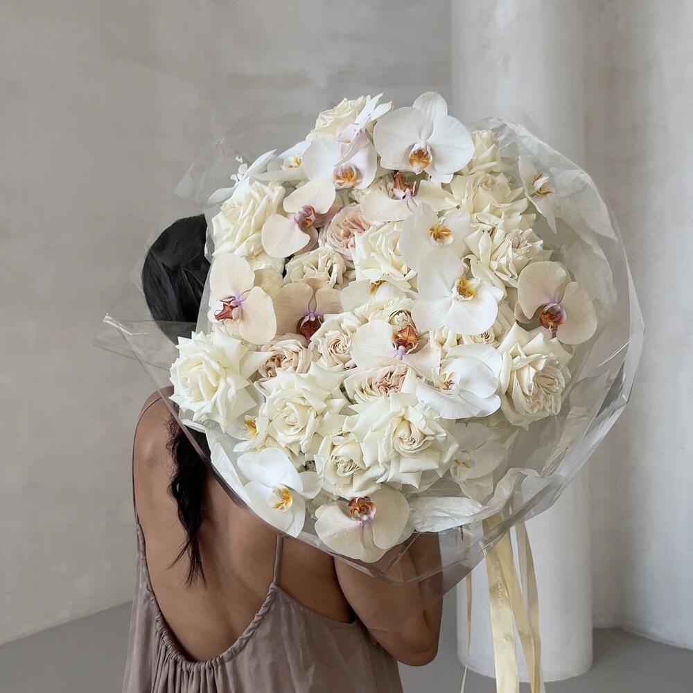 роза пионовидная плая бланка – 36 шт.Орхидея Фаленопсис – 19 шт.тишью кремовое – 1 шт.Слюда – 1 шт.открытка брендированная в подарок – 1 шт.