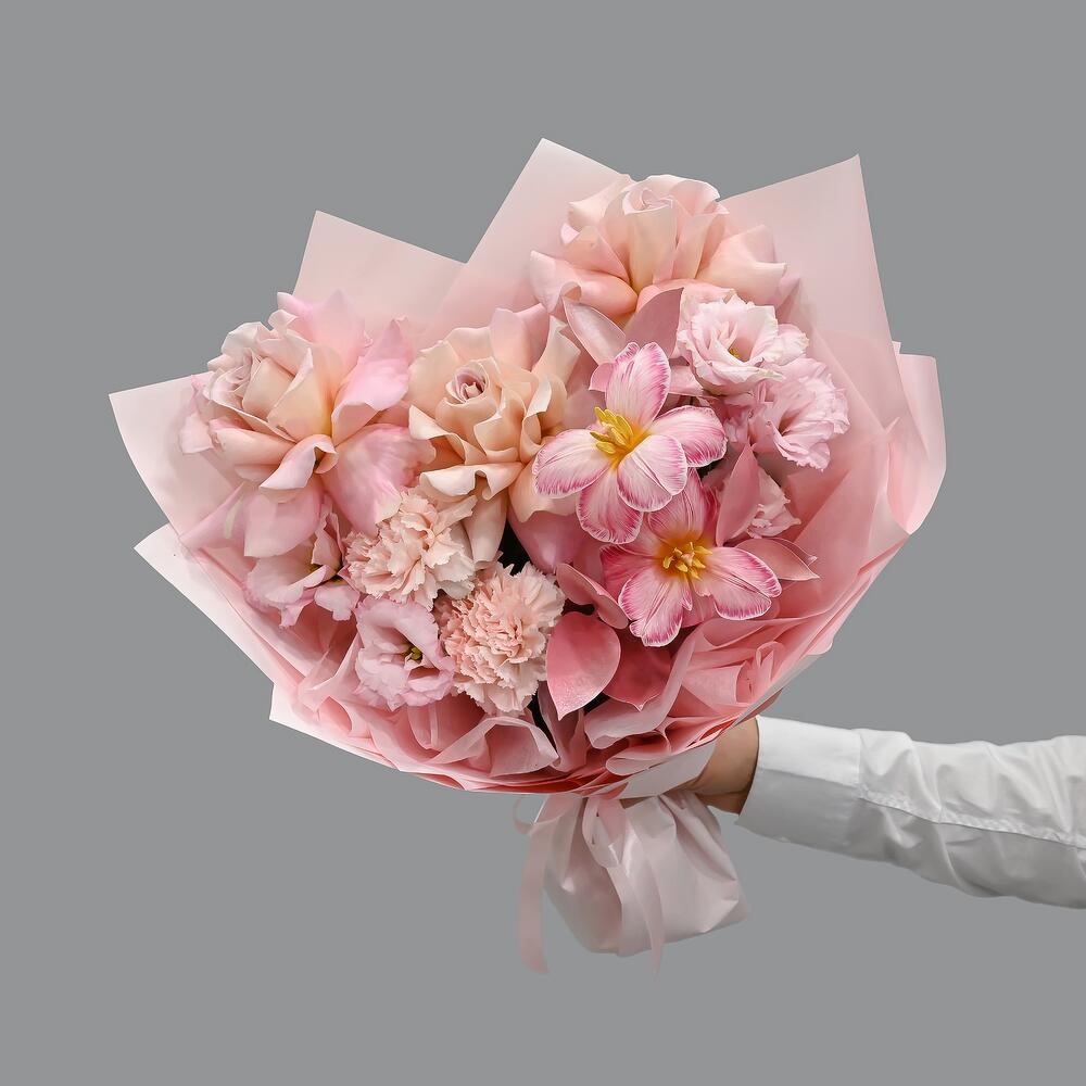 Французская роза – 3 шт.Эустома – 1 шт.Гвоздика – 2 шт.Тюльпан – 2 шт.Рускус – 3 шт.Упаковка дизайнерская – 1 шт.