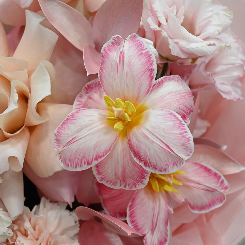 Категории: Гвоздики, Лизиантусы, Розы, Тюльпаны