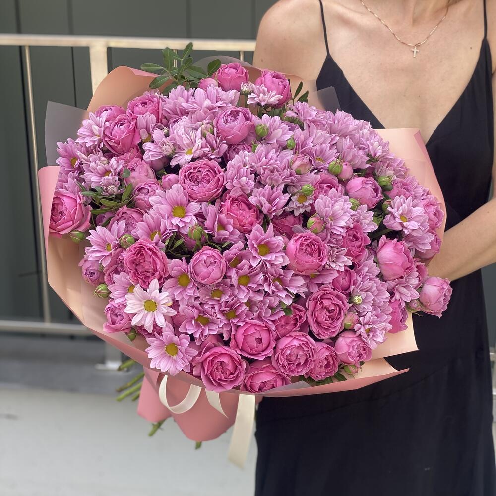 Хризантема гранд пинк – 14 шт. кустовая пионовидная роза misty bubbles – 10 шт. Писташ – 5 шт. Оформление – 1 шт.