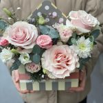 роза одноголовая пинк мондиаль – 3 шт.куст роза – 1 шт.эустома белая – 2 шт.Хризантема кустовая – 1 шт.Эвкалипт – 1 шт.Гипсофила – 1 шт.Зелень – 1 шт.