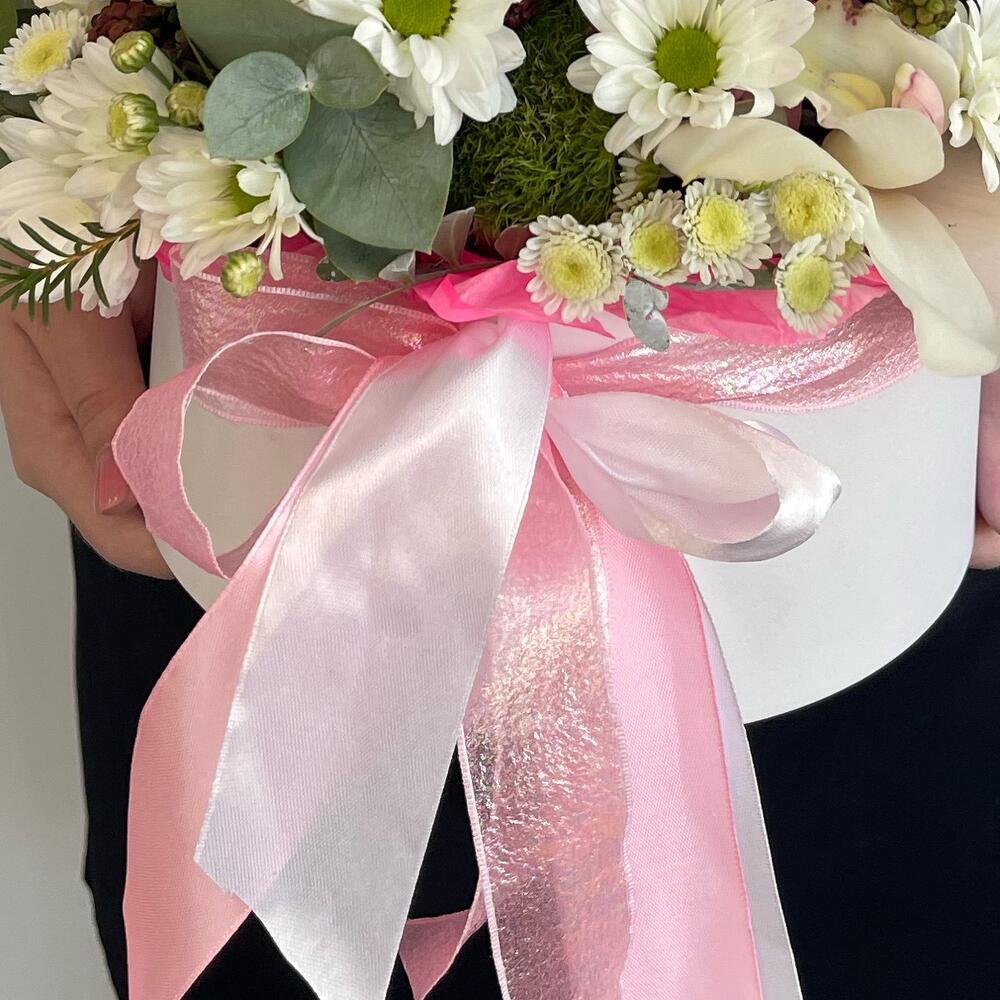 Коробка шляпная – 1 шт.Лента атласная – 2 шт.вибририниум – 1 шт.Роза кустовая – 3 шт.Лизиантус – 1 шт.Рубус – 1 шт.орхидея – 3 шт.white o’hara – 1 шт.Хризантема кустовая – 2 шт.Гербера мини – 3 шт.
