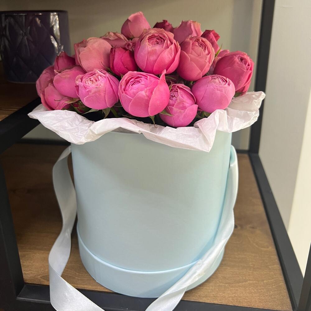 Пионовидная роза кустовая – 11 шт.Шляпная коробка – 1 шт.Аквапак – 1 шт.Тишью – 1 шт.