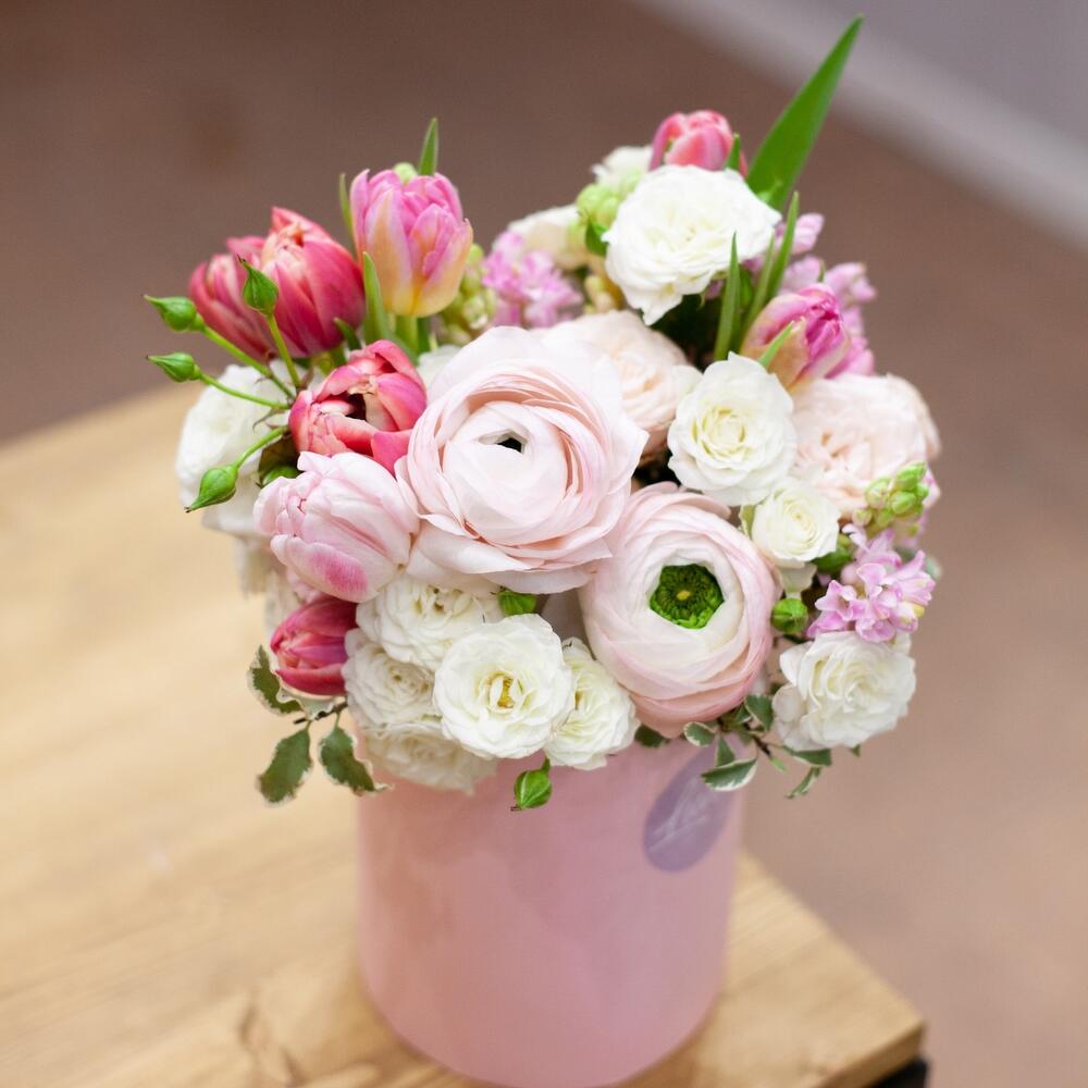 Нежная композиция с розовыми лютиками в шляпной коробке ❤️