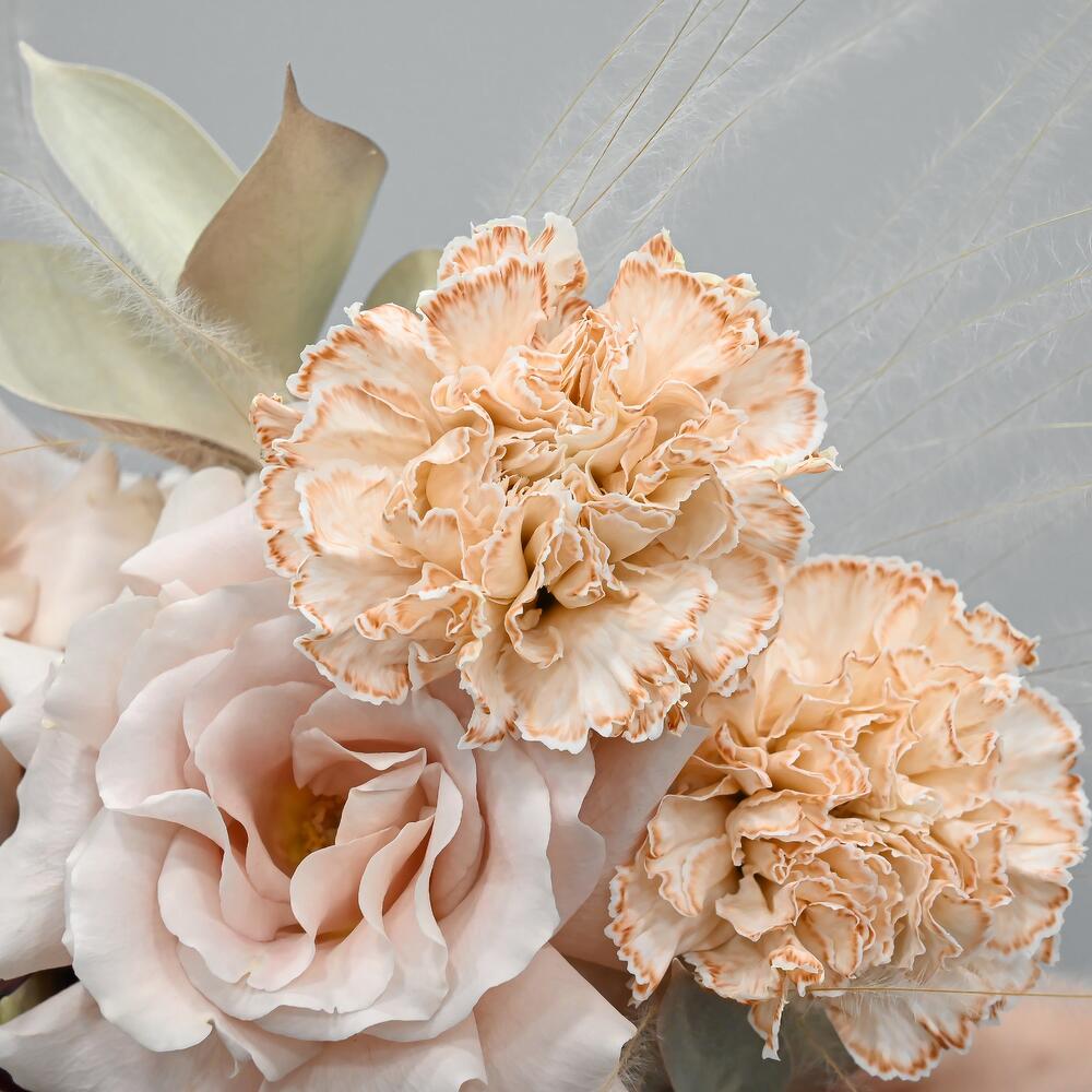 Элегантный свадебный букет в кремовой цветовой гамме. В составе французские розы, сортовая гвоздика, кустовая роза, экзотический леукадендрон и воздушная стифа.Флористы студии Цветочный Этикет собрали его из самых свежих цветов. Букет готов сиять красотой на всех фотография.