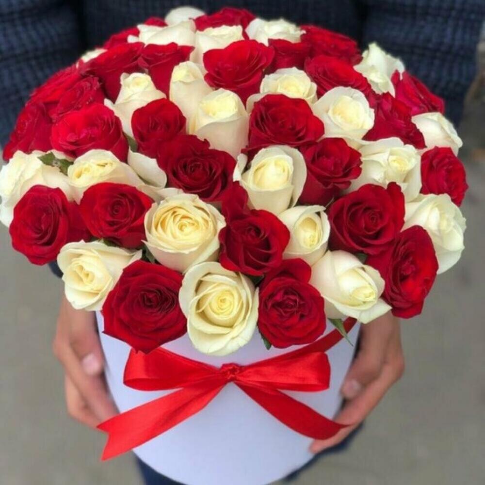 розы микс 40 см – 51 шт.шляпная коробка в ассортименте – 1 шт.Оазис флористический – 1 шт.Лента атласная – 1 шт.