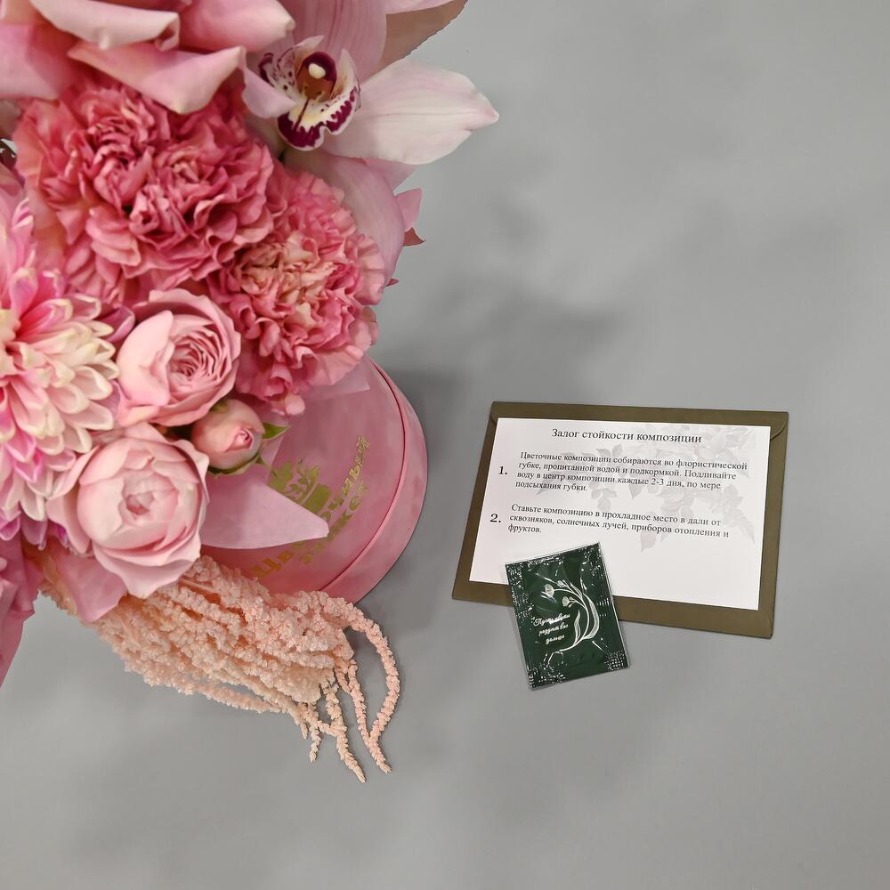 Французская роза – 5 шт.Орхидея Цимбидиум – 3 шт.Хризантема – 1 шт.Эустома – 4 шт.Гвоздика – 5 шт.Пионовидная кустовая роза – 4 шт.Аралия – 1 шт.Амарант – 1 шт.Рускус – 3 шт.
