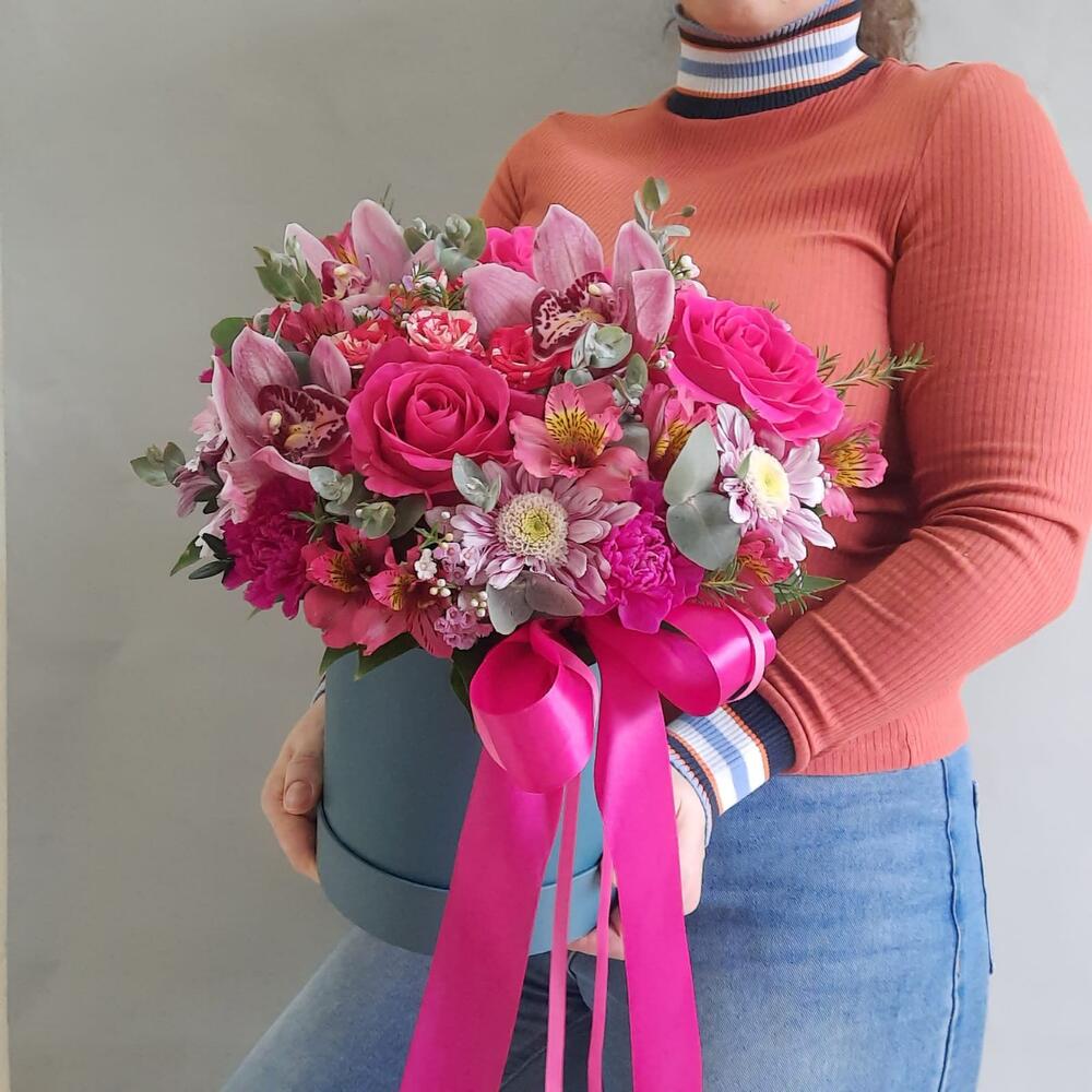 Роза – 3 шт.Орхидея Цимбидиум – 3 шт.Диантус – 5 шт.Роза кустовая – 1 шт.Хризантема кустовая – 1 шт.Альстромерия – 3 шт.Эвкалипт – 2 шт.Рускус – 7 шт.Самшит – 2 шт.Ваксфлауэр – 1 шт.Оазис флористический – 1 шт.Коробка шляпная – 1 шт.Лента атласная – 2 шт.