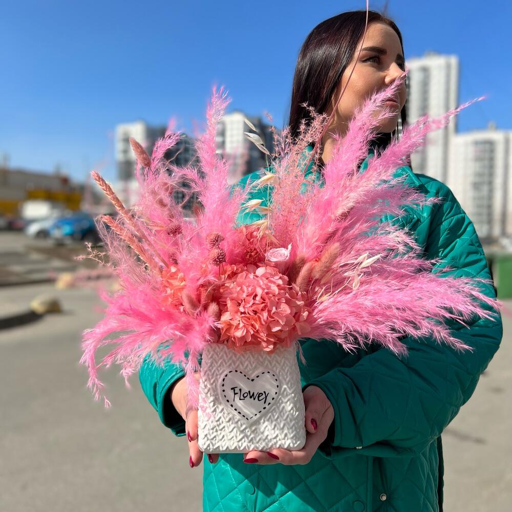 Композиция в керамическом кашпо с гортензией,кортадерией,лагурусом,нигеллой,розой,пшеницей,клевером