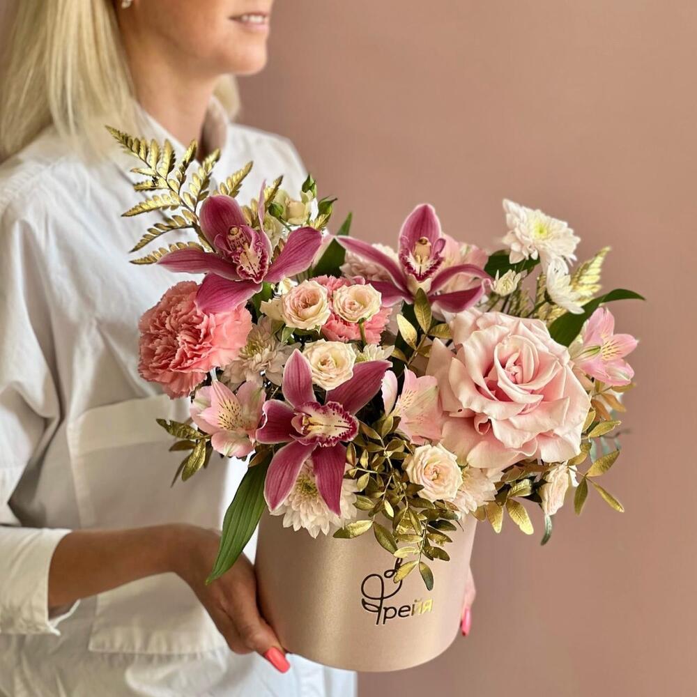 Альстромерия – 1 шт.Орхидея Цимбидиум – 3 шт.Папоротник – 1 шт.Роза кустовая – 1 шт.Хризантема кустовая – 1 шт.Гвоздика – 2 шт.Фисташка – 2 шт.Коробка брендированная – 1 шт.Роза пинк мондиаль – 1 шт.Губка флористическая – 1 шт.