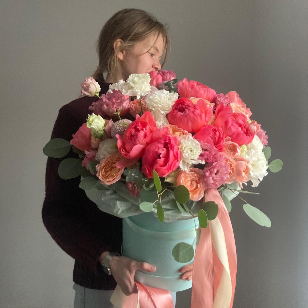 Пион – 10 шт.Роза кустовая пионовидная – 7 шт.Лизиантус – 9 шт.Гвоздика – 11 шт.Хризантема – 5 шт.Эвкалипт – 5 шт.Коробка шляпная – 1 шт.Лента атласная – 2 шт.Тишью – 2 шт.Оазис флористический – 2 шт.