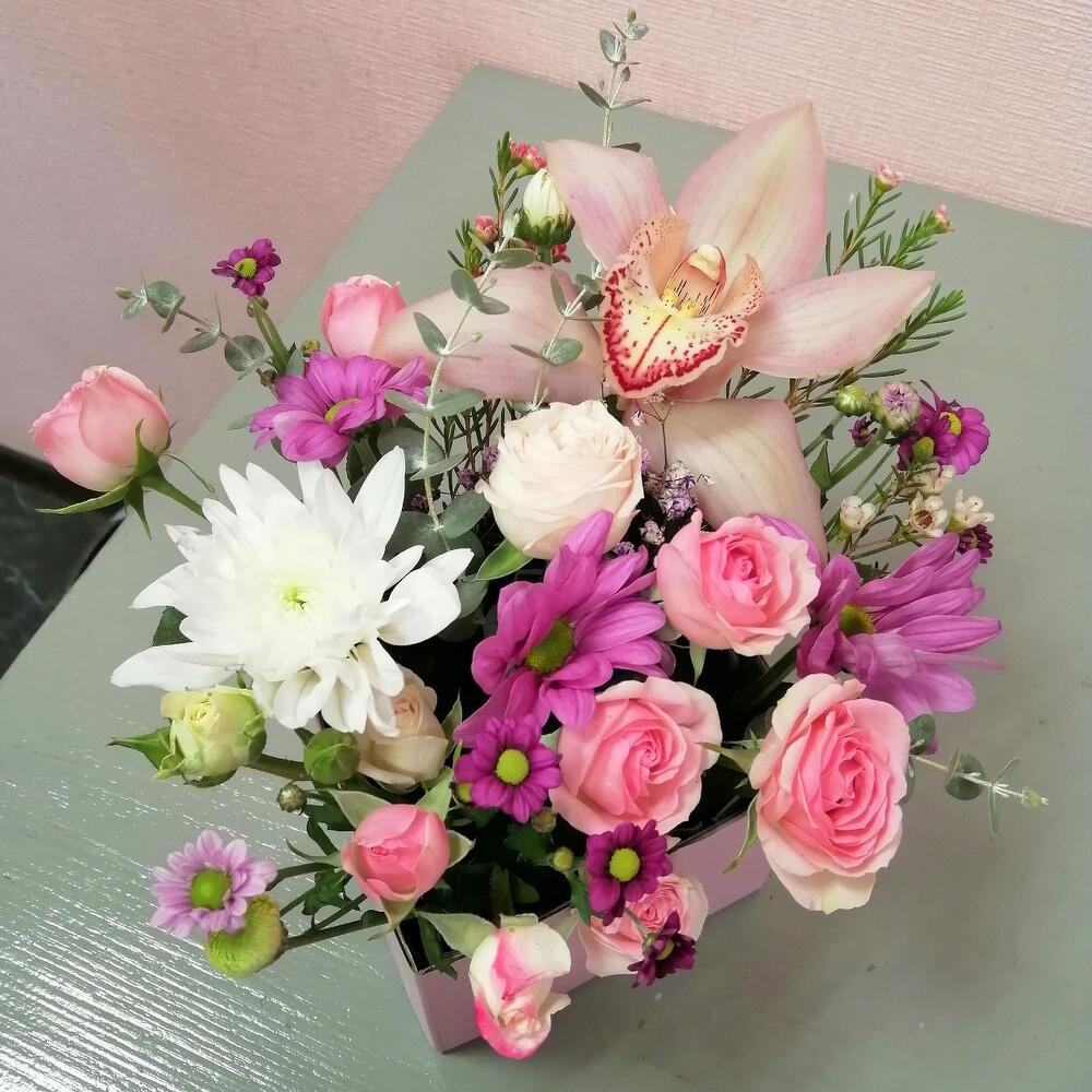 орхидея колокольчик – 1 шт.Роза кустовая – 1 шт.Хризантема кустовая – 1 шт.Ваксфлауэр – 1 шт.Оазис флористический – 1 шт.Коробка прямоугольная – 1 шт.Эвкалипт – 1 шт.