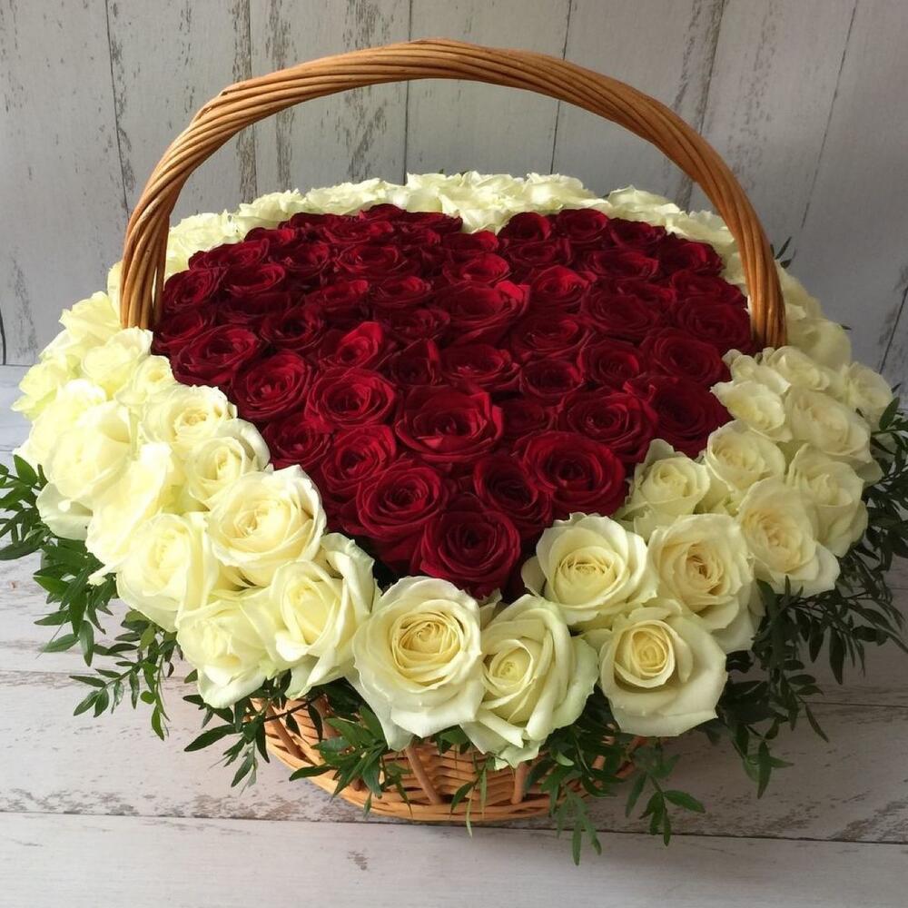 Красная роза – 50 шт.белая роза – 51 шт.Фисташка пучок – 2 шт.Корзина плетеная – 1 шт.Оазис флористический – 3 шт.