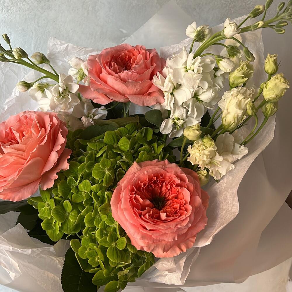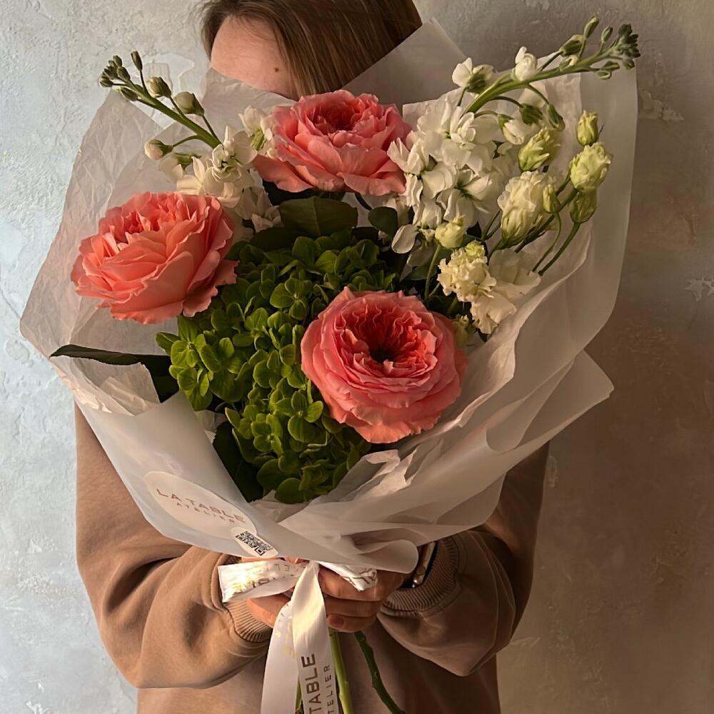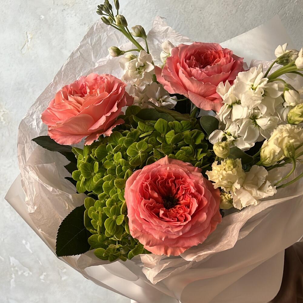 Гортензия – 1 шт.Роза пионовидная – 3 шт.Маттиола – 2 шт.Лизиантус – 1 шт.Упаковка дизайнерская – 1 шт.