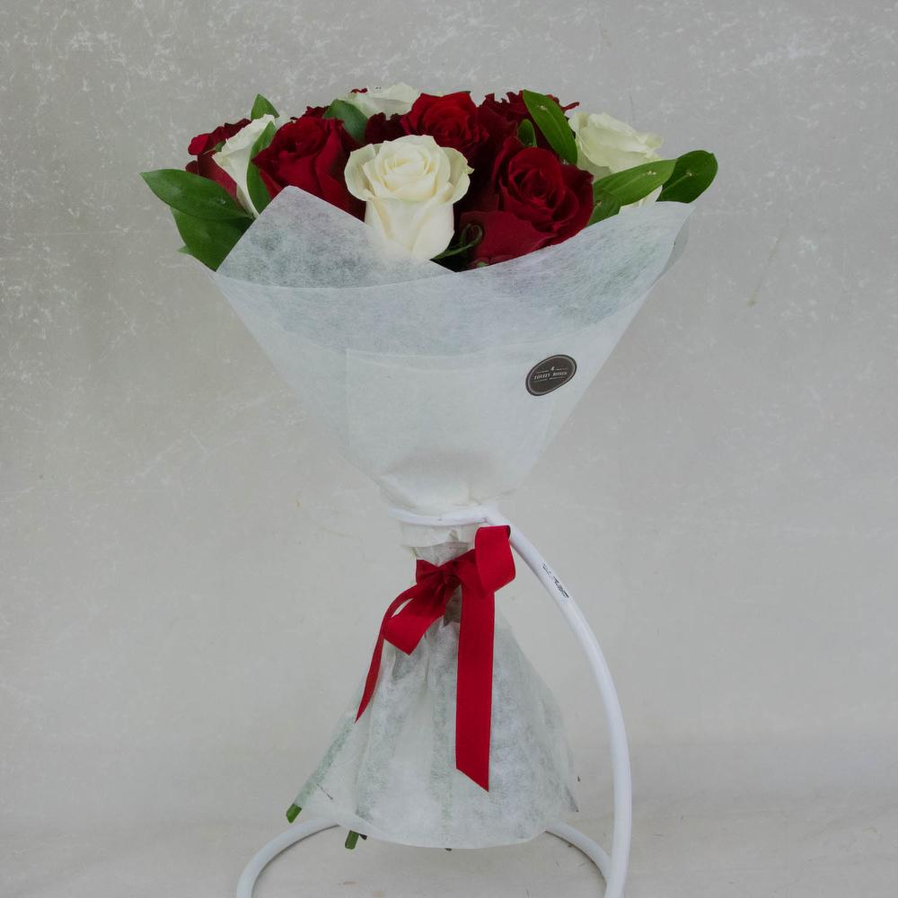 Букет из красных и белых роз с упаковкой. Приблизительный размер 35×65 Букет для тех, кто любит все естественное. Букет обернут натуральным крафтом в таких же тонах. Все символизирует вместо близости к природе. К подарку обычно прикладывается наша карточка с красиво напечатанным текстом вашего послания. К букетам обычно прилагается рекомендация по уходу и объяснением причин. При доставке температура в машине курьера контролируется нами в зависимости от сезона.