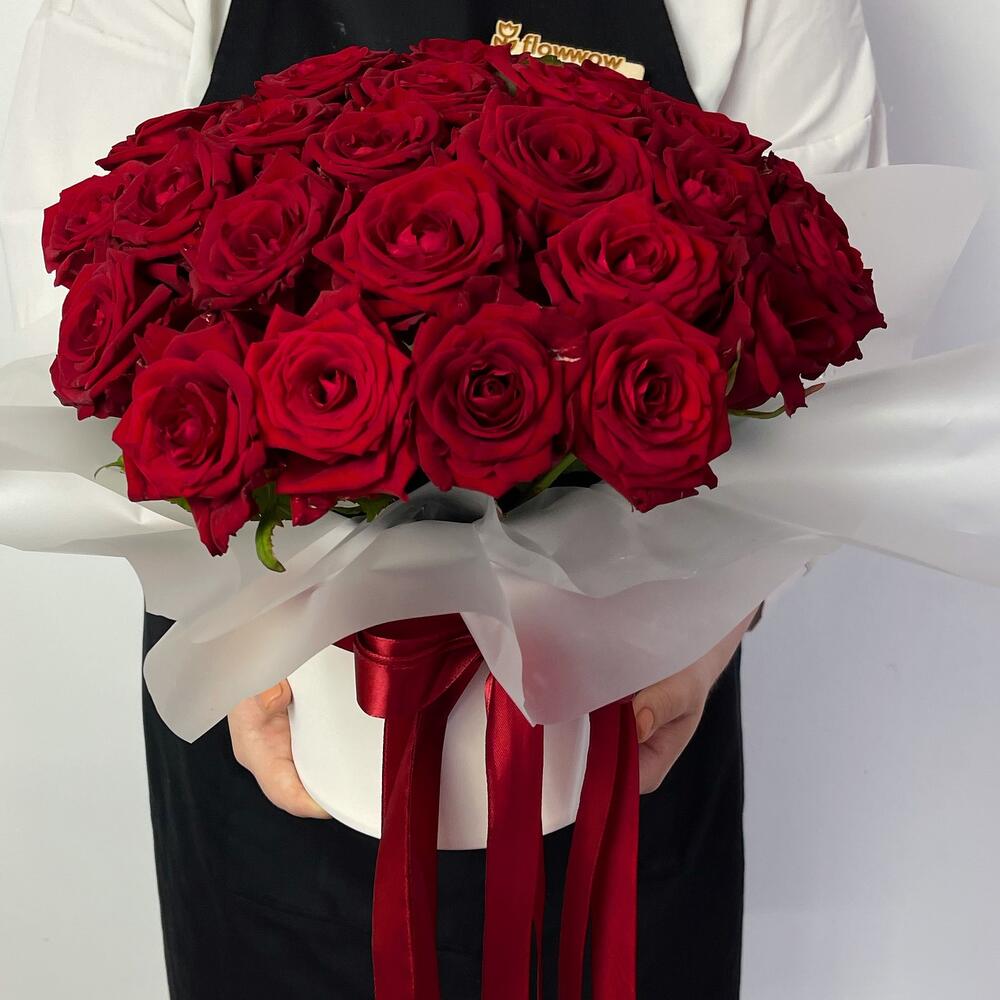 Оазис флористический – 1 шт.Коробка белая – 1 шт.красные розы – 27 шт.